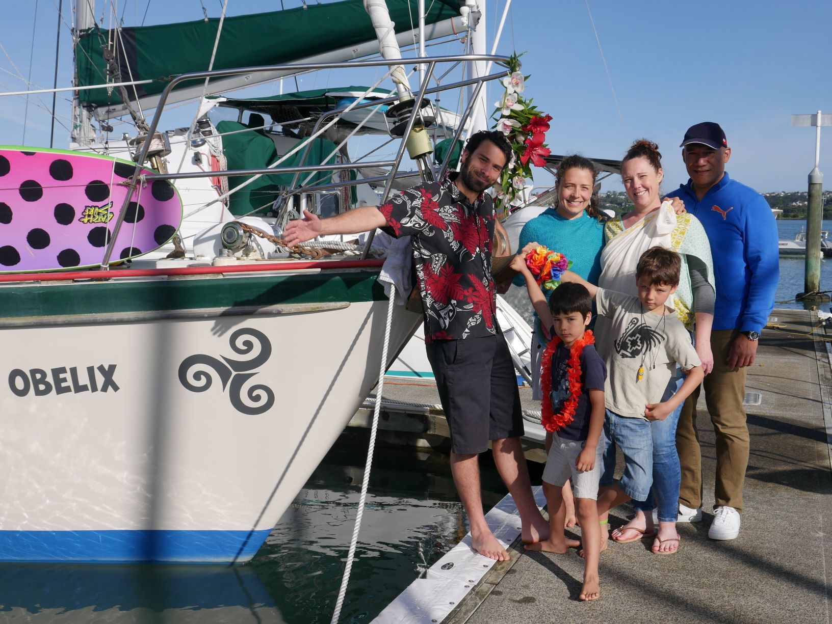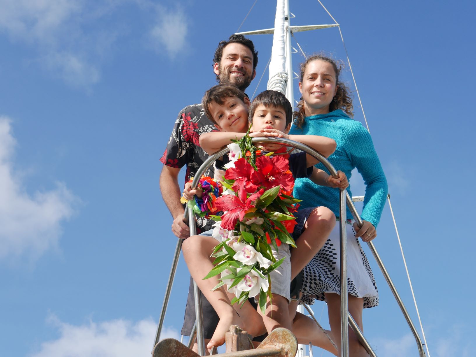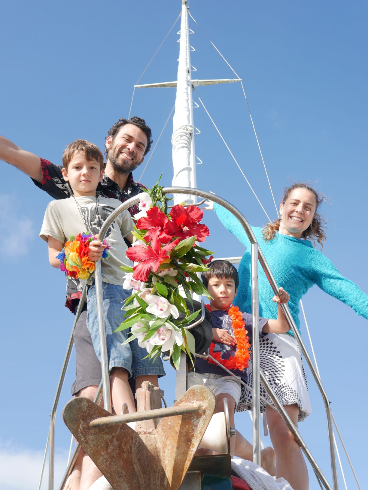 At 8 am on Sunday the 13th, at high tide, after a full-moon night, our dear friend Naomi rocked up all dressed up with orchids and hibiscus flowers around her neck and arms ready to lead Obelix’ blessing ceremony. We showed her and Dave around, had a quick chat, and finished to prepare ourselves. Our outfits were carefully chosen for the occasion, a T-shirt brought back from my trip to Argentina for Zephyr, an “I’m the captain of my own life” T-shirt offered by Mamidou for Azur, a black and red Fijian shirt bought just before a delivery trip for Thomas, and the colourful Desigual dress bought during our trip to Canada for me. The boys insisted on wearing their gems and surfboard necklaces which I had to untangled from the mess in my jewellery box, and I even found a couple of fake flower necklaces in our dress-up bag to brighten things up. We then each took our position on the jetty, next to Obelix anchor and Naomi started creating a sacred space with a nice prayer-song and distributed the four hibiscus flower bracelets she had weaved for us. We shared our boat stories and intentions, sang Nga Iwi E as a family (on Azur’s explicit request, and you should hear him on the “Tamatu, tamatu”!), all took part in Mahalo call and response song, and finally we interlaced our individual lays with Obelix big orchid necklace to obtain a colourful flower composition which we hang off the pulpit.