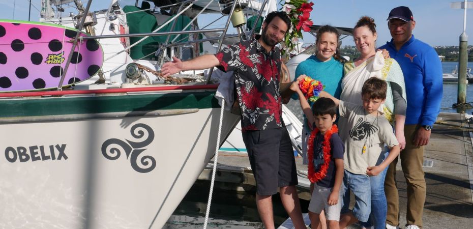 At 8 am on Sunday the 13th, at high tide, after a full-moon night, our dear friend Naomi rocked up all dressed up with orchids and hibiscus flowers around her neck and arms ready to lead Obelix’ blessing ceremony. We showed her and Dave around, had a quick chat, and finished to prepare ourselves. Our outfits were carefully chosen for the occasion, a T-shirt brought back from my trip to Argentina for Zephyr, an “I’m the captain of my own life” T-shirt offered by Mamidou for Azur, a black and red Fijian shirt bought just before a delivery trip for Thomas, and the colourful Desigual dress bought during our trip to Canada for me. The boys insisted on wearing their gems and surfboard necklaces which I had to untangled from the mess in my jewellery box, and I even found a couple of fake flower necklaces in our dress-up bag to brighten things up. We then each took our position on the jetty, next to Obelix anchor and Naomi started creating a sacred space with a nice prayer-song and distributed the four hibiscus flower bracelets she had weaved for us. We shared our boat stories and intentions, sang Nga Iwi E as a family (on Azur’s explicit request, and you should hear him on the “Tamatu, tamatu”!), all took part in Mahalo call and response song, and finally we interlaced our individual lays with Obelix big orchid necklace to obtain a colourful flower composition which we hang off the pulpit.