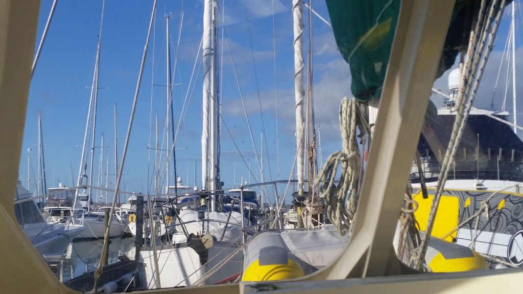… I win! Tucked in the central cockpit, the sun caressing my neck, with an enviable view on a clear blue sky, striped vertically by the marina masts, feet resting on a hatch frame, I am not touching the ground…