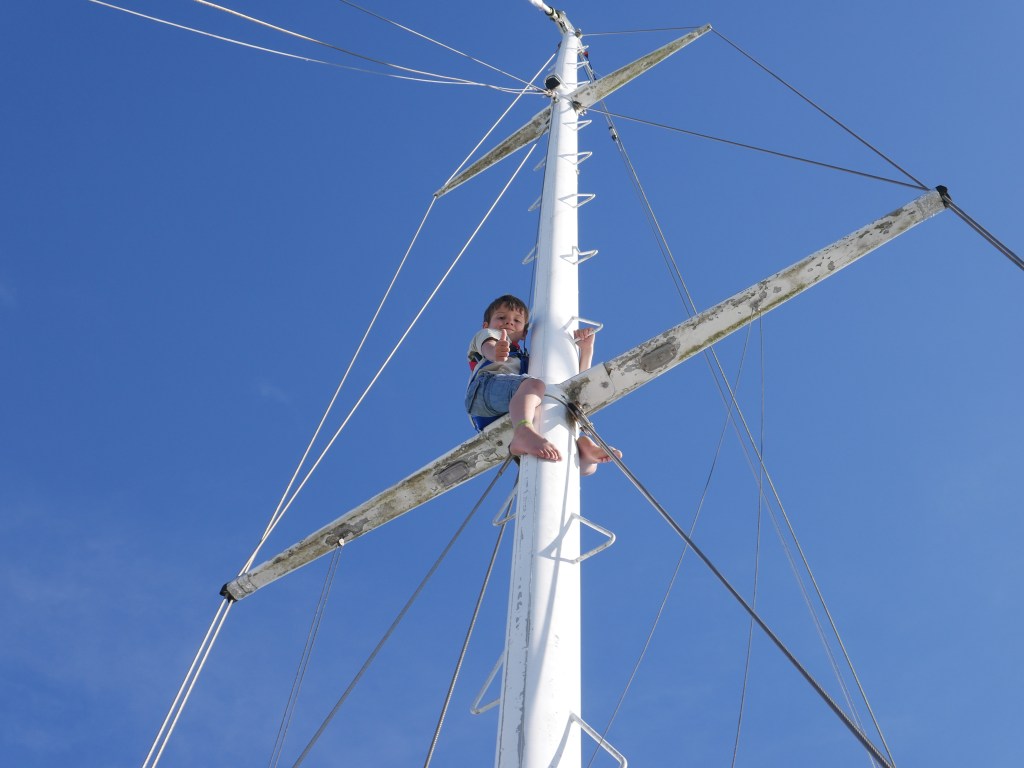 • We’re not allowed to climb the mast when we are sailing. So intense is our new feeling of freedom, that being forbidden to climb up the mast seems like a big restriction in this little fellow’s life. Think of all the children who don’t even have the opportunity to climb up any mast at all, you ungrateful child!!!
