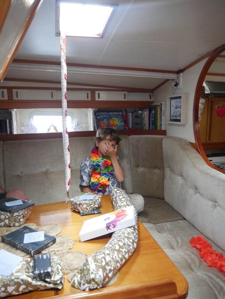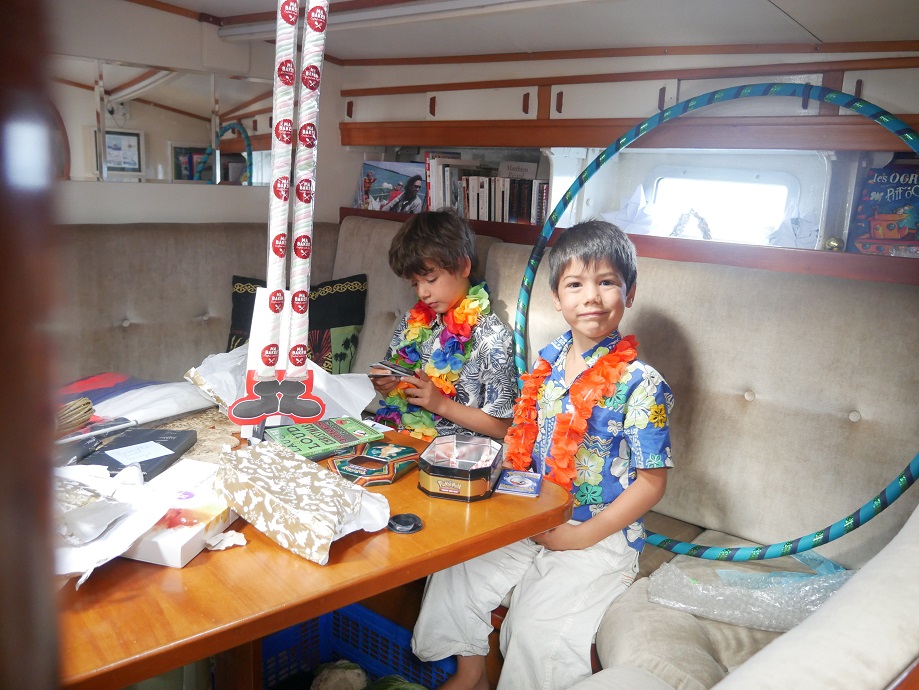 I don’t know how we gather the energy to wrap up the presents that night, write Zephyr and Azur a letter each, and hang Santa’s marshmallow legs from one of the hatches to surprise them in the morning, but I’m glad we did. For one they let us sleep in, and when they do wake up, it is with a merry energy, Zephyr announcing cheerfully “Santa’s been” and Azur quickly hurrying along to witness with his own eyes. They only have a couple of presents to unwrap each, yet they’re ecstatic about Santa’s accuracy, who’s brought Azur a handful of Pokemon cards, a couple of candy canes, and a Christmas jokes book, exactly as he’d asked for. And in a simliar fashion – Santa isn’t very creative this year, nor was he helped by Zephyr’s letter which evasively stated he’d be grateful to get about anything, or maybe he ‘s aimed for fairness and reached it with clockwork precision, Zephyr gets a handful of Pokemon cards, a couple of candy canes, and a book: “The Hundred Mile An Hour Dog” which he reads three times on Christmas day, a couple more the following one, and encourages his brother to read it too.