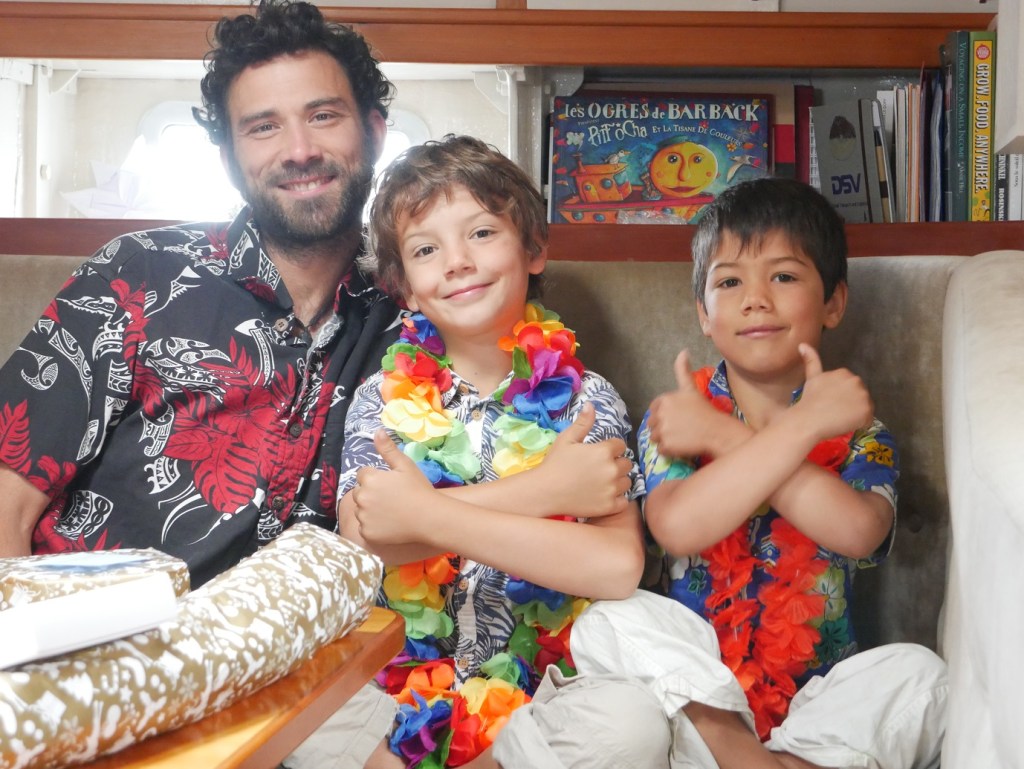 After having fed the hungry family, we still have to balance our lack of sleep (we got up at 5:30am this morning), our low morale (of all considered scenarios for the holidays, none featured Christmas eve spent alone at Algies’Bay in diesel fumes), and the kids’ need to let their energy out of the confined space, quickly cluttered with newspaper, tools, and rags everywhere. Christmas Eve isn’t celebrated as we’re used to with an orgy of decadent food, alcohol and chocolates. Instead we force ourselves out of the boat and onto shore late that 24th December afternoon, after many failed attempts to bring the engine to life. Thomas and Azur have a splash in the water, after which we treat ourselves to a hot shower at our friends Chris and Anne’s batch, conveniently located right on the beach, opposite where we are anchored. We’ve brought everything to fix ourselves a couple of home made pizzas eaten in between a game of cranium.