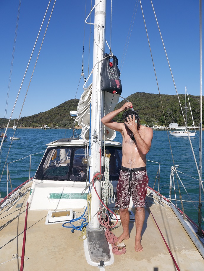 The anchor is nearly all the way up when suddenly the engine stops without warning. Holly sh*! Thomas promptly hoists the mainsail to get control of the boat in a bay fairly full of other vessels, while I’m thinking, let’s go and try to figure something out on the way. We’re on a sail boat after all and only need the engine to maneuver in and out of anchorage. Now that it’s broken down, we’ll have to anchor by sail anyway, whether it is right now to stay on Kawau, or in a few hours to anchor on Great Barrier. Besides, if it has to do with a low battery, it should have time to charge with the solar panels during the day and we could try again later and decide whether to carry on or turn back if is still not starting. (*yesterday we couldn’t start the engine because the engine battery was down and we had to charge it while plugged on Ad Hoc’s alternator, this is apparently an issue with both service and starter batteries plugged in parallel by mistake, an issue we’ll have to sort out). So off we go, with Ad Hoc following us closely behind. We communicate on VHF channel 6 explaining to our friends what has just happened and our intentions. They don’t seem so optimistic about our plan, explaining that the wind could die off half way through the crossing in which case we’d be a dire situation with no engine to propel us. Fair enough. We finally decide to anchor in Vivian Bay with Ad Hoc moored raft-style, and try charging the battery to the max as we did yesterday. An hour or so later, the battery is at its fullest yet the engine still refuses to start. Either there is something wrong with the battery system or the problem is elsewhere. It is still early in the day with plenty of time to find a solution. We bid our friends farewell as they set sails to Great Barrier as planned albeit a few hours delay in the initial schedule.