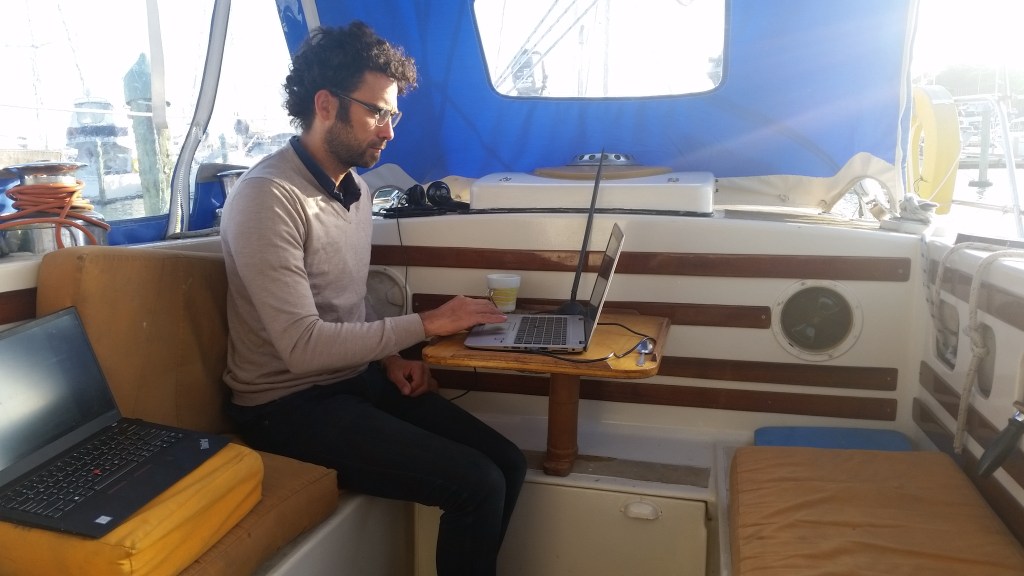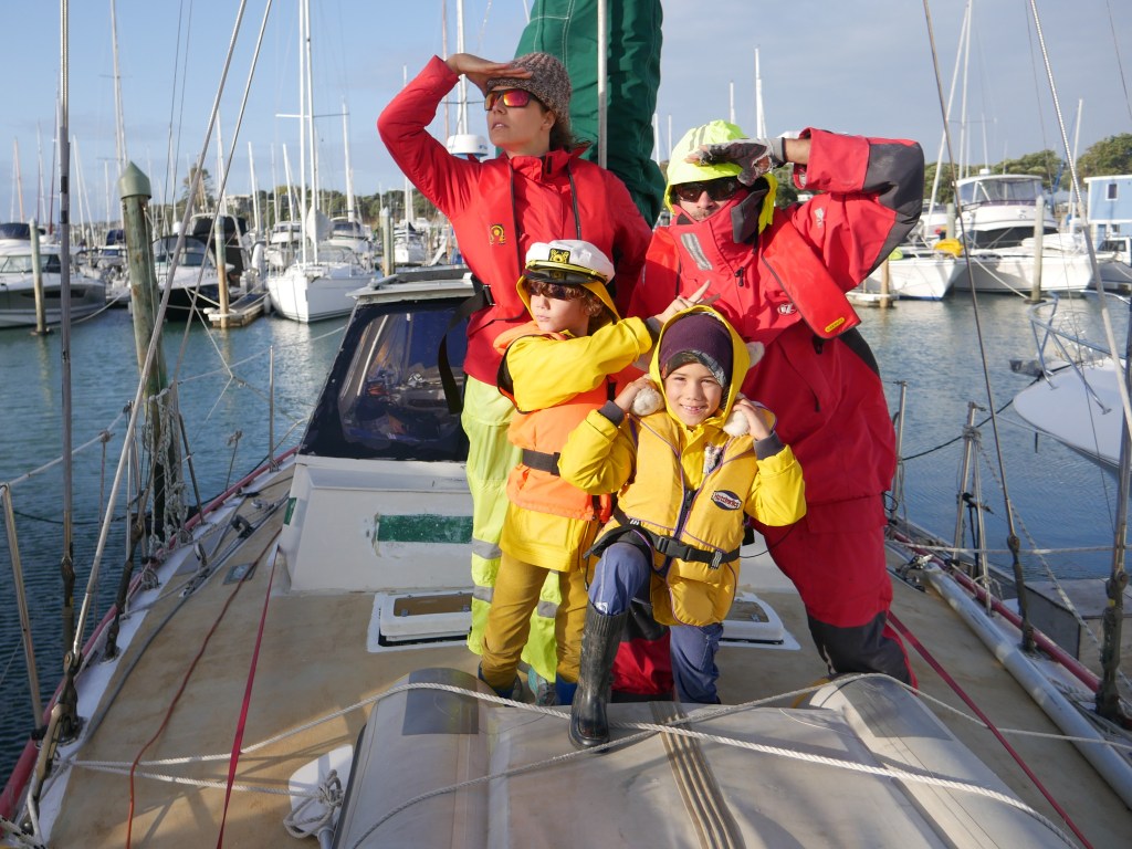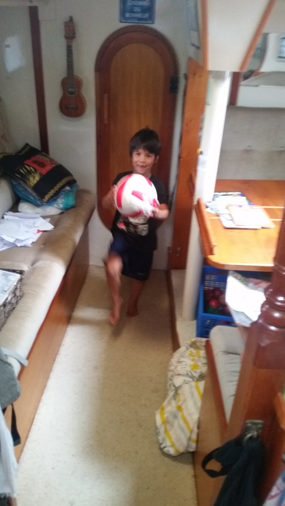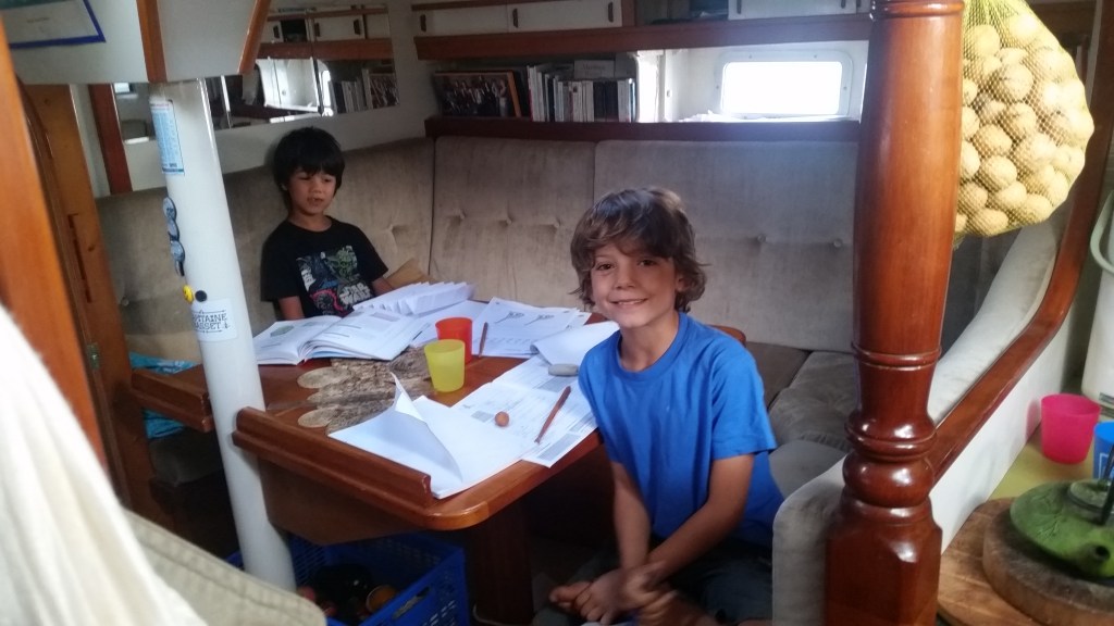 On a positive note, Azur woke up this morning announcing happily “first day of school on the boat!” and the home-schooling quickly turned into “self-schooling” following a schedule we had prepared together the evening before, and which, although not respected to the letter, provided a good beacon to see us through the day. The kids particularly enjoyed climbing up the mast between two showers, doing ‘hard’ (as opposed to boring) maths, with Zephyr explaining powers and square roots to Azur, building huts in the V-berth, playing soccer with a volleyball in the saloon corridor, and, with a bit of persuasion, dressing up for a photoshoot at sunset (cf. top pictures). We’re betting hard on our creativity to endurejoy this weird, forced, ‘recentering’ retreat, and take it as a good practice exercise for an ocean crossing…