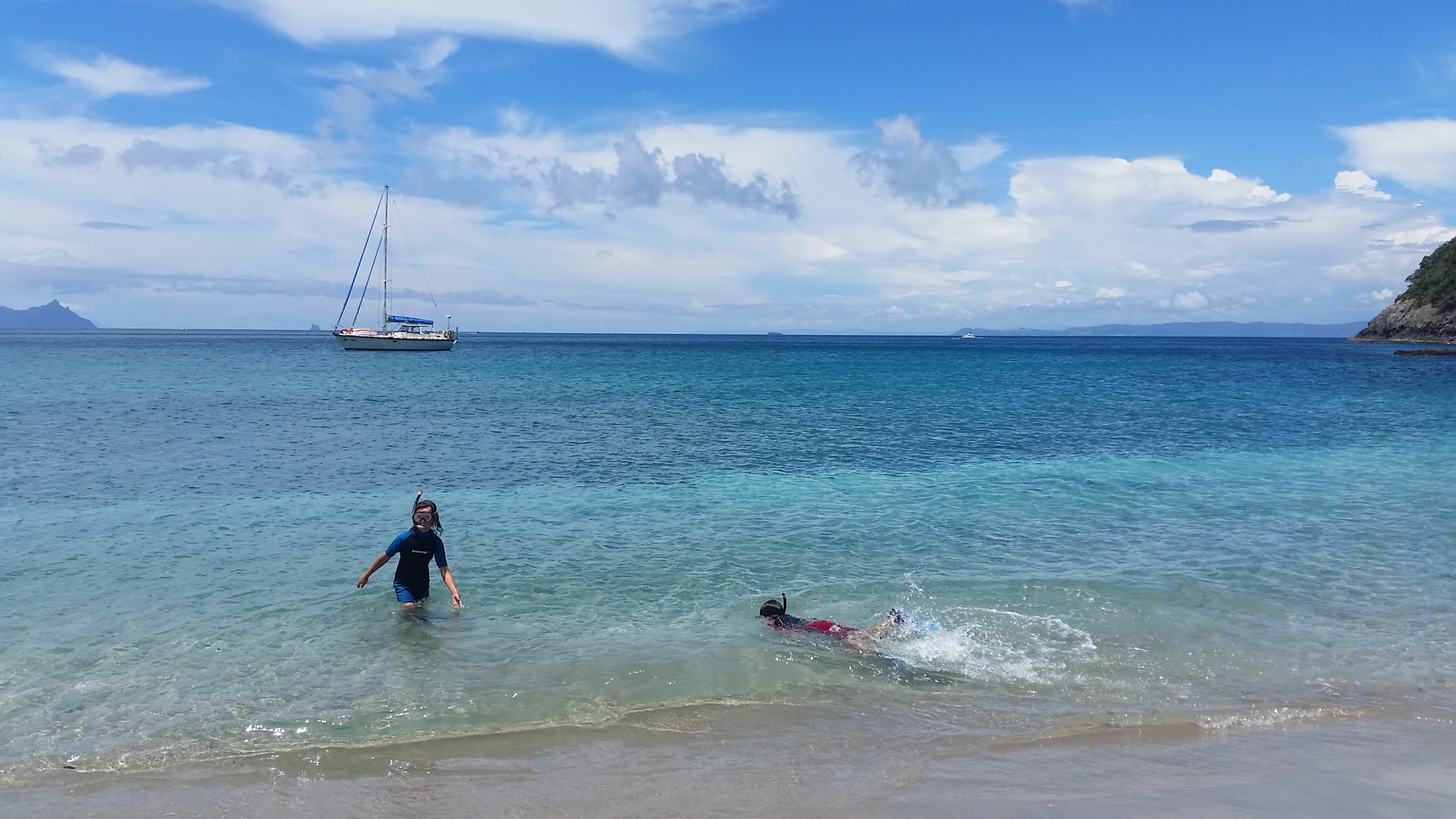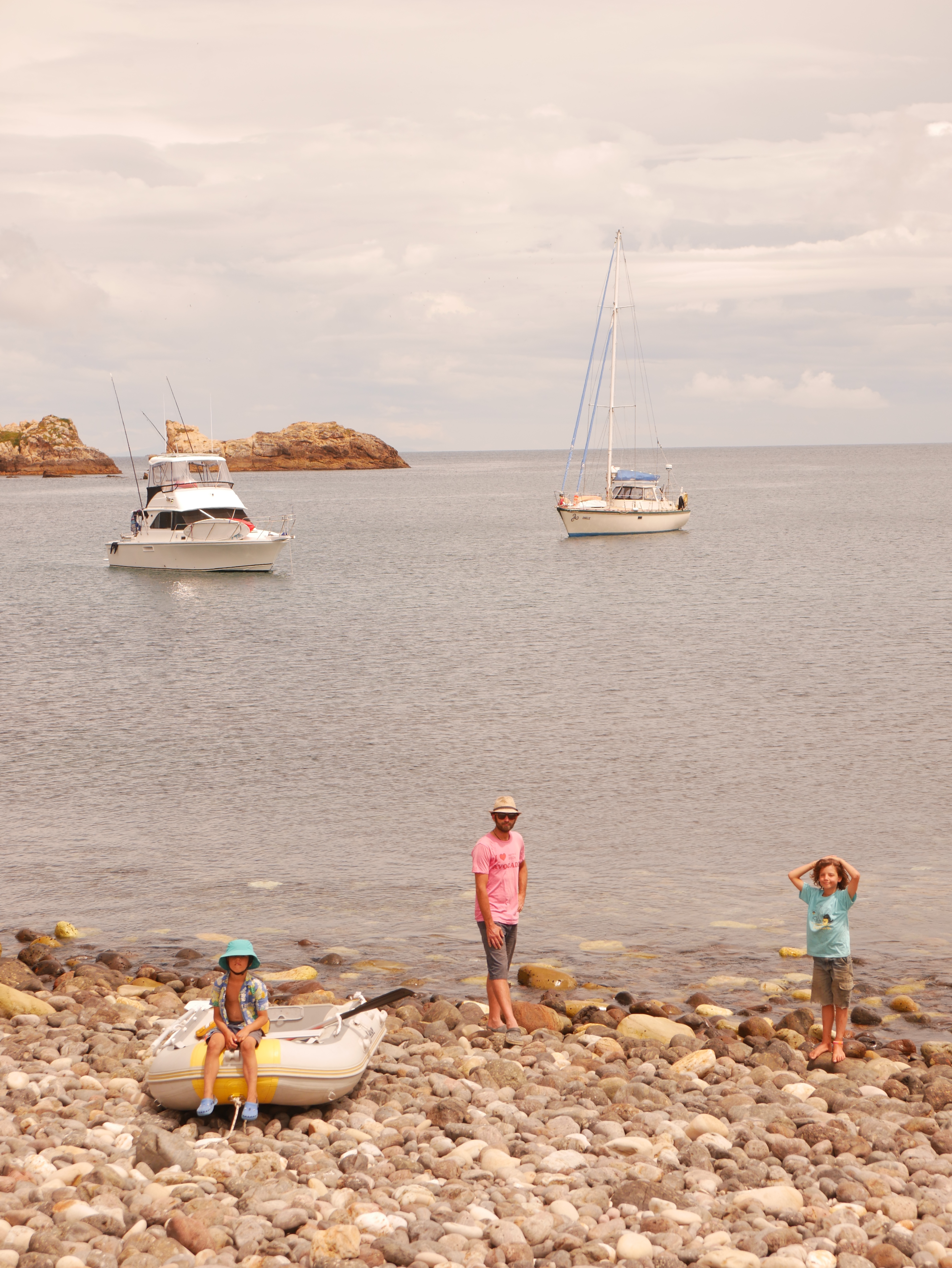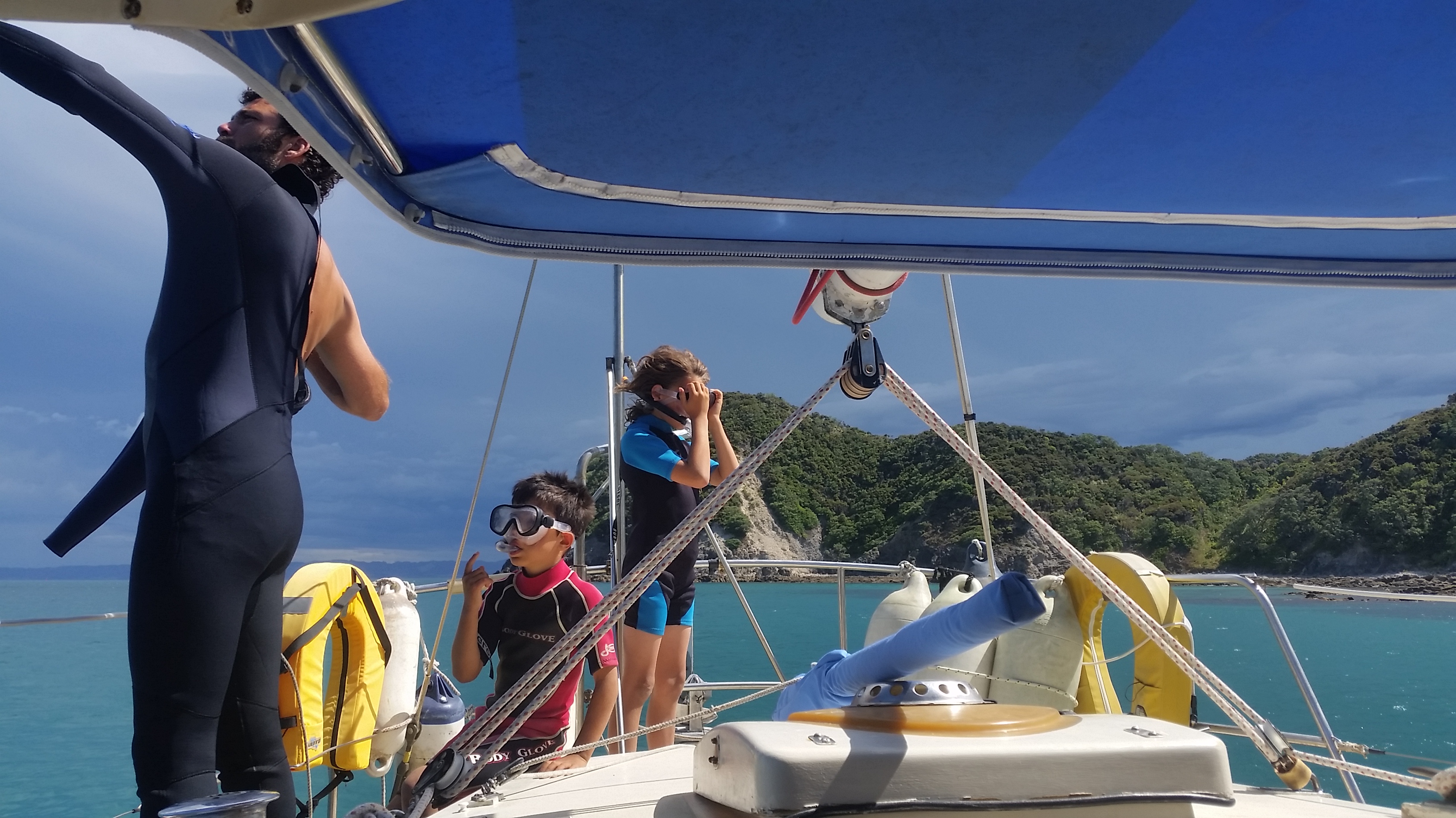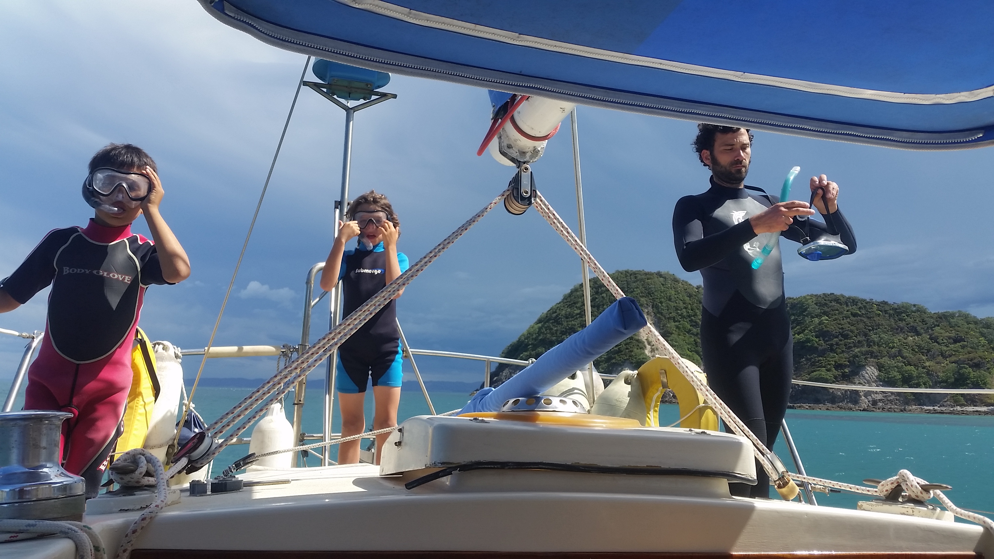 We are so thrilled by the beauty of the scenery when we arrive in Okahu Passage that we immediately call our respective mums to share our delight, and show them the idyllic sandy beach which we have almost to ourselves, the crystal clear water, the glittering sun, the fish and stingrays that swim around the boat, and the boys getting dressed for yet another snorkeling session. We have left Whangamumu at dawn, as per usual before a long navigation, so that we can have a few hours of peace before the boys wake up, enjoy the sunrise a cup of tea warming our hands, and arrive early-ish to our next destination. It is just about breakfast time and we’ve already filled our stomachs with cake. Ready to jump in. A morning routine to be repeated ad lib.