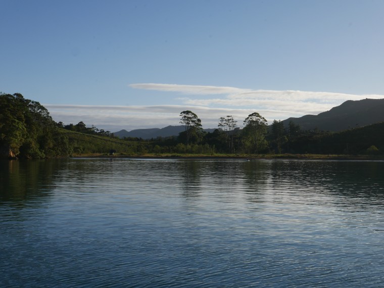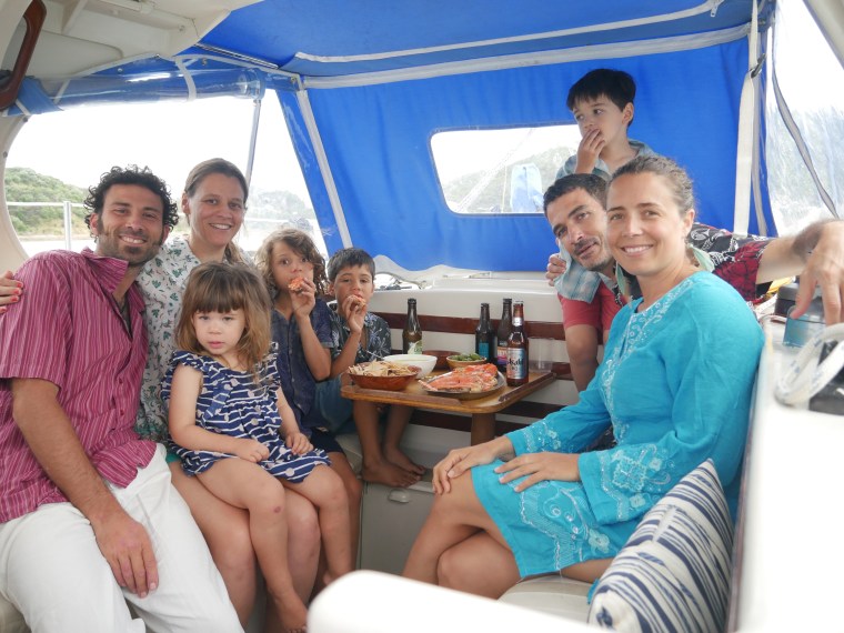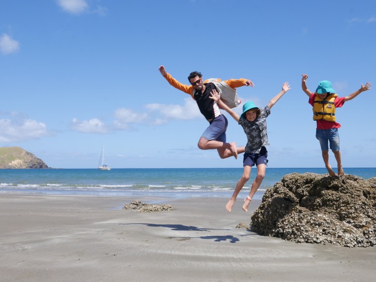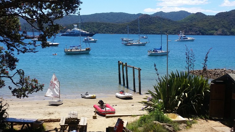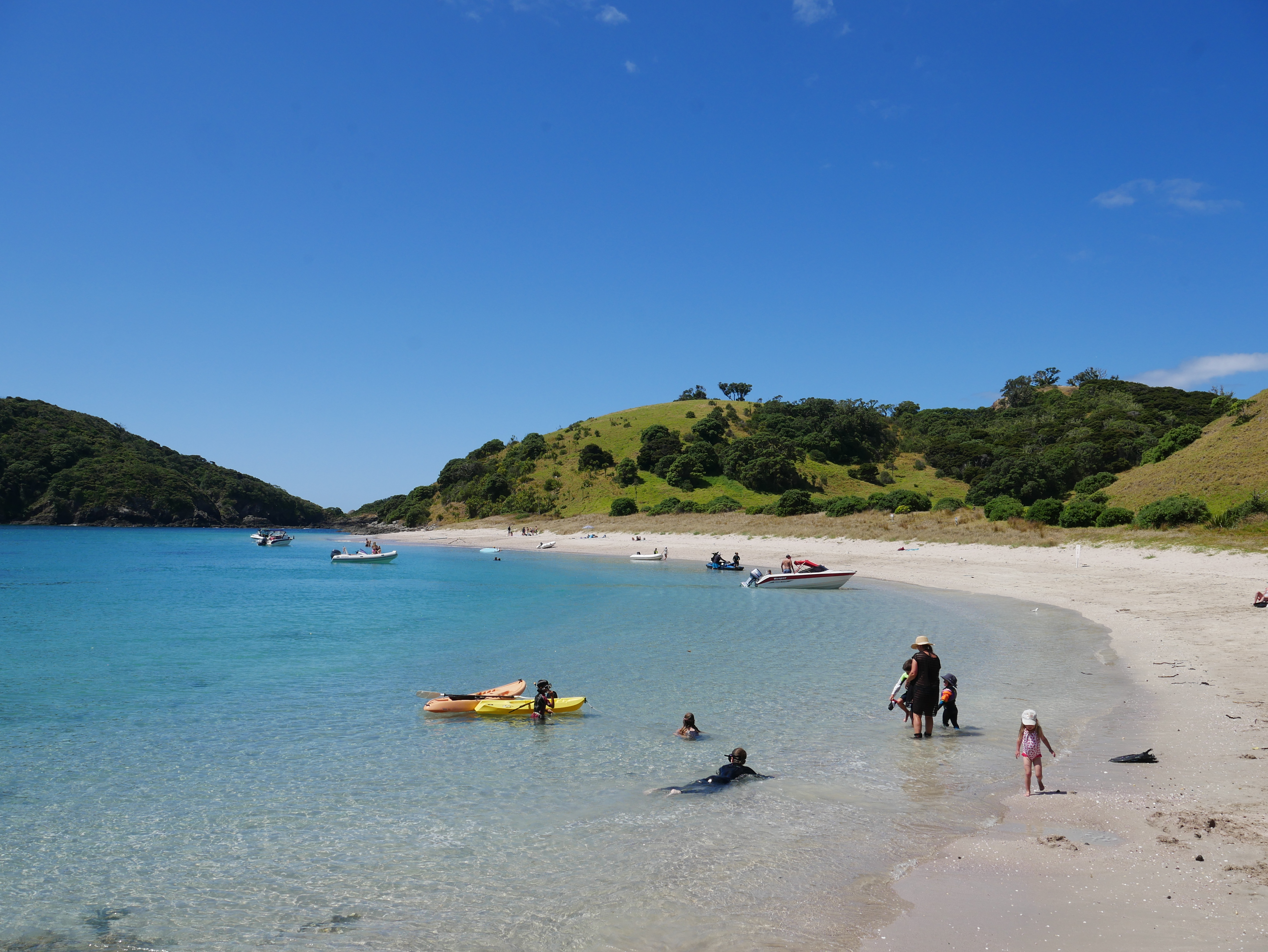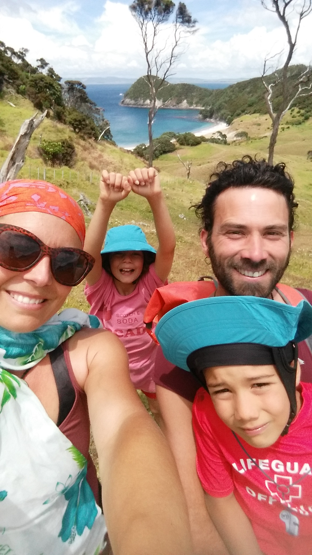 We are so thrilled by the beauty of the scenery when we arrive in Okahu Passage that we immediately call our respective mums to share our delight, and show them the idyllic sandy beach which we have almost to ourselves, the crystal clear water, the glittering sun, the fish and stingrays that swim around the boat, and the boys getting dressed for yet another snorkeling session. We have left Whangamumu at dawn, as per usual before a long navigation, so that we can have a few hours of peace before the boys wake up, enjoy the sunrise a cup of tea warming our hands, and arrive early-ish to our next destination. It is just about breakfast time and we’ve already filled our stomachs with cake. Ready to jump in. A morning routine to be repeated ad lib.