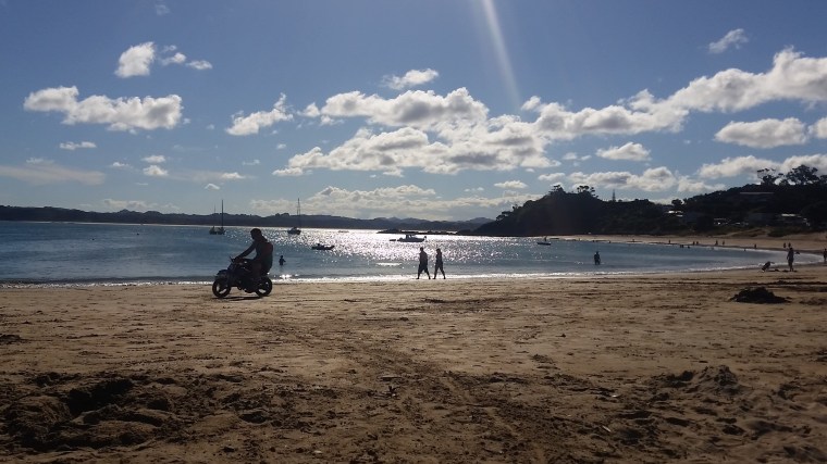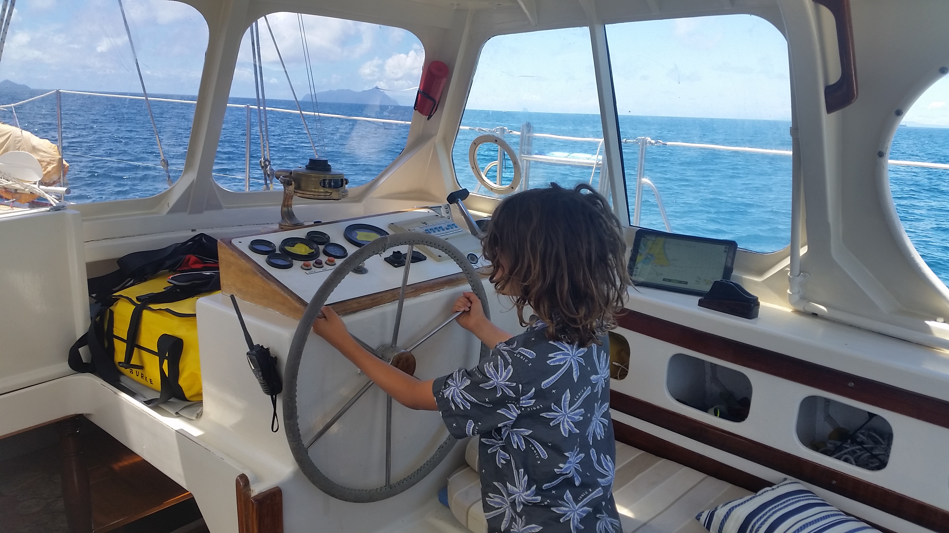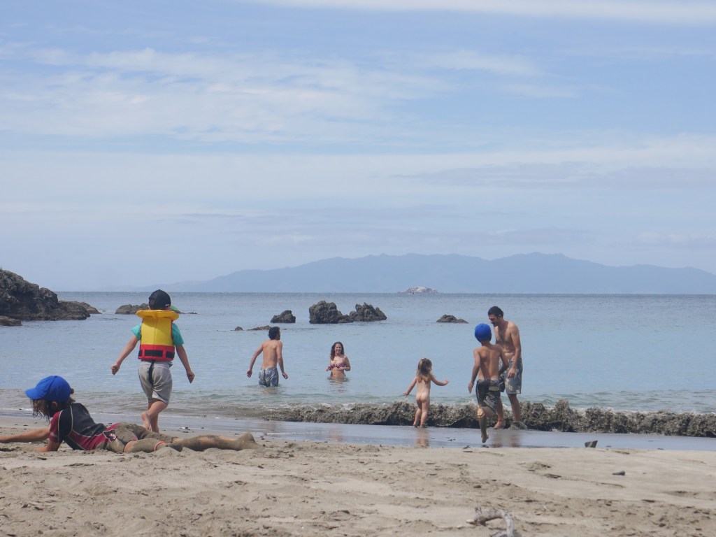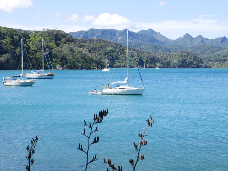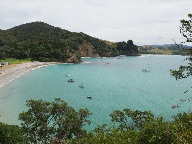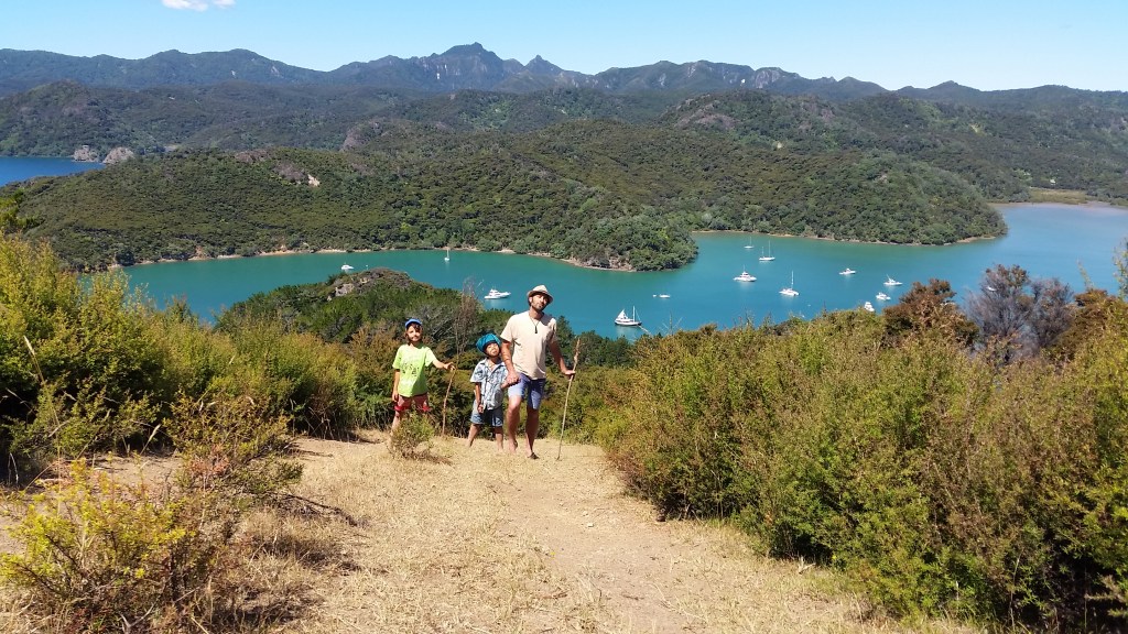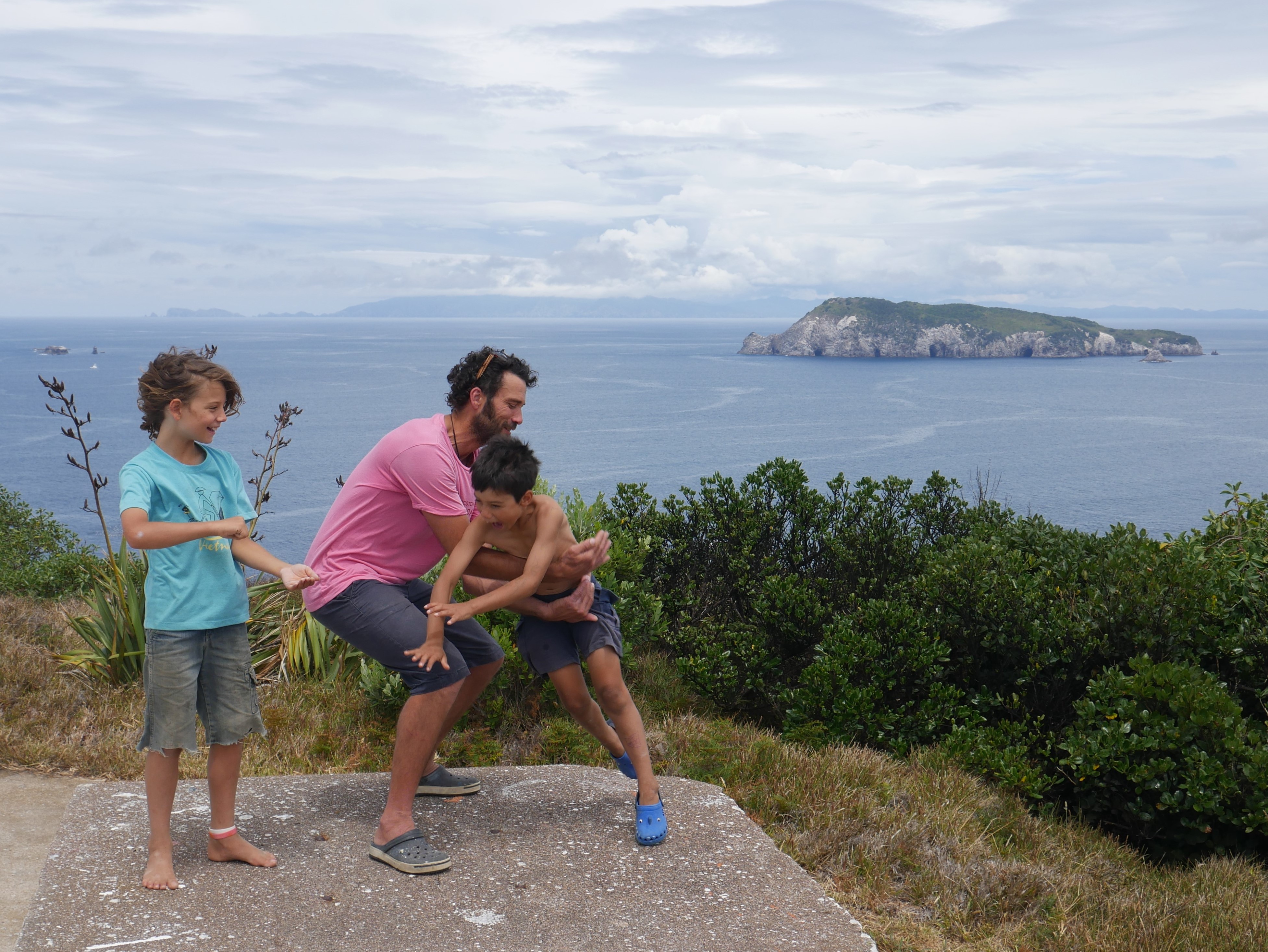 No time to grab the camera, the boys just manage to pop their head in the cockpit to glimpse the shadow of the massive marine mammal swimming away on starboard. The rest of the trip is spent eyes glued to the tablet to monitor our speed which peaks above 9 knots at times, when I manage to get Obelix surfing the waves. An exhilarating feeling but tiring nonetheless. So much so that when we arrive in Whangaparapara, I formally request a break to flush the adrenaline from my system.