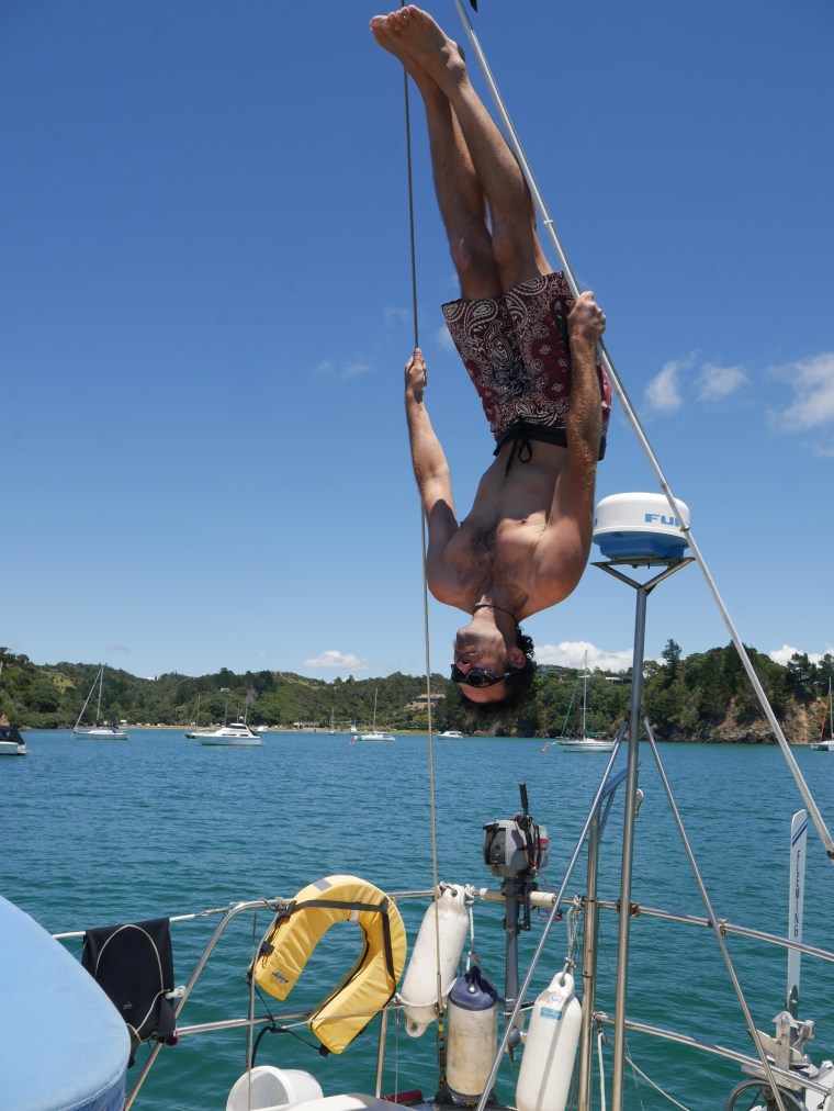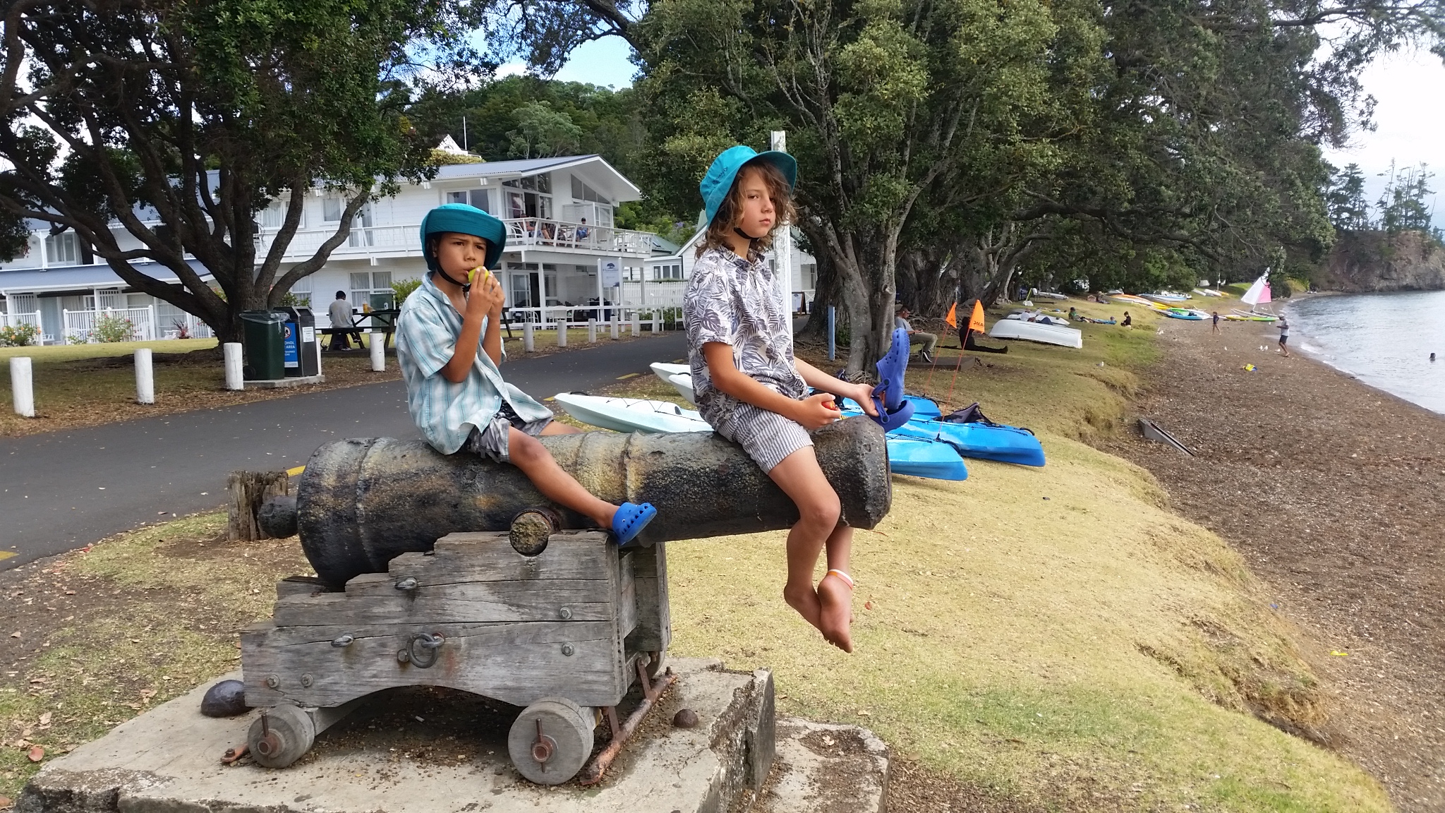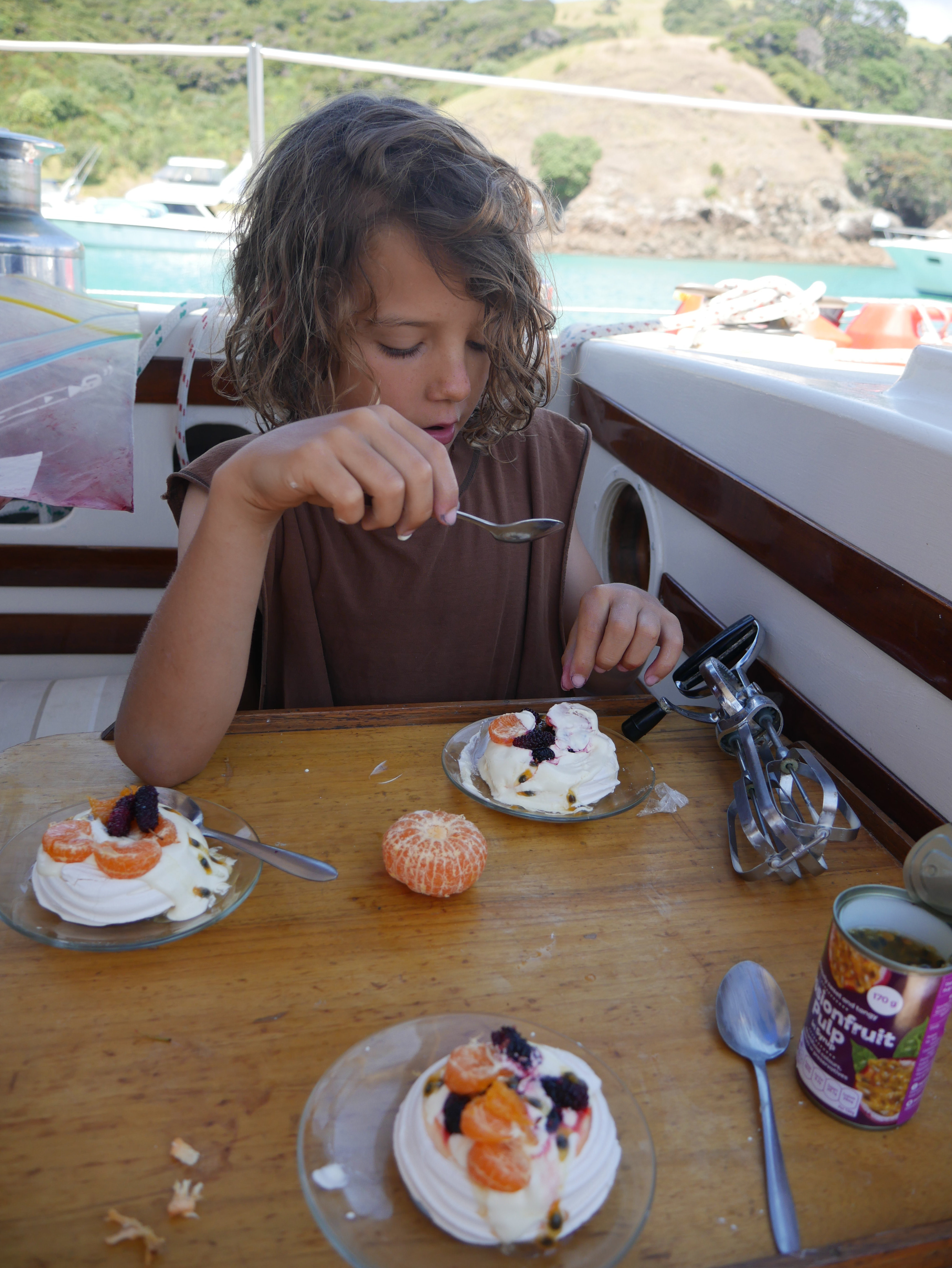 What a welcoming committee when we arrive in Russell: We anchor next to Calypso, right before the start of the Tall Ship regatta, and just in time to have lunch with our friends Julia & Eric who are leaving Bay of Islands that day. And to top it off, we gather for dinner around a gigantic maori hāngi followed by a ball with live music, with hundreds of yachties, among whom we have the pleasure to count many friends, Bayswater school parents, ex-colleagues, ex-fellow Bulgarian choir singers, or people who helped us renovate Obelix back in Whangarei. Blessed serendipity. Highlights of that evening feature Zephyr standing up on Thomas shoulders, hands dyed purple, as he is picking mulberries from a tall tree, eating many in the process, distributing some to intrigued or skeptical people who are not sure they’re edible, and keeping the rest for the pavlova we’ve promised to have for dessert the next day, as a celebration of our arrival in Bay Of Islands.