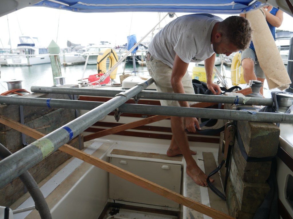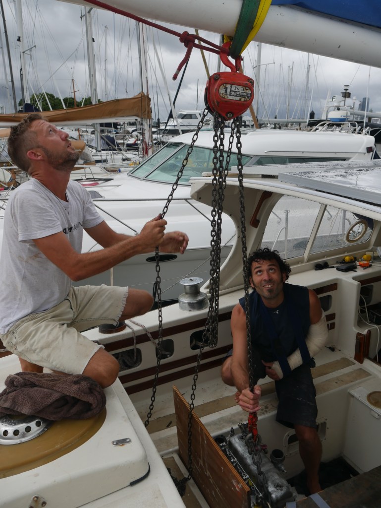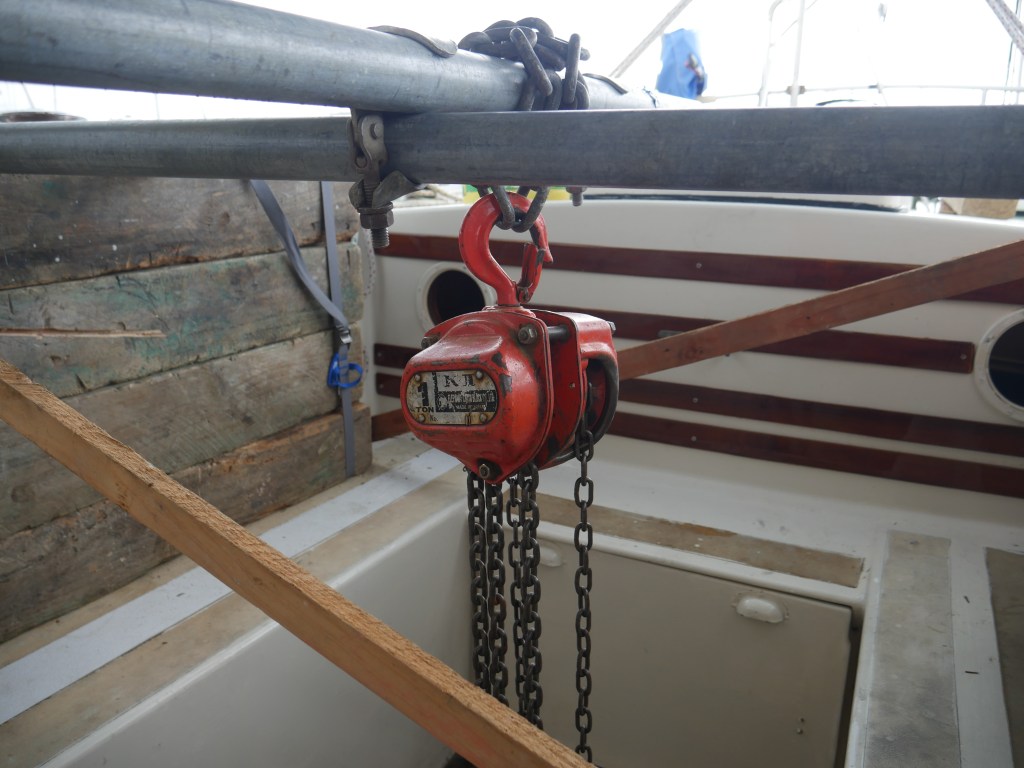 - Build a second makeshift crane hanging from the boom for transfer on the pier (using main halyard + jib halyard as backup, and reef line used as out-haul)