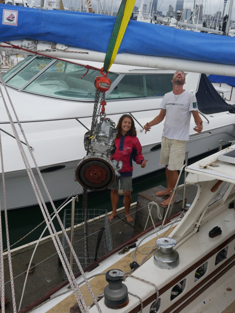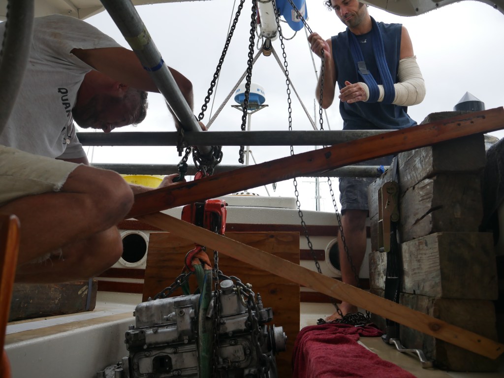 - Remove bolts on gearbox (x12) and screws fixing the engine legs to the boat (x8)