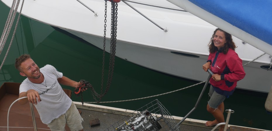 - Remove bolts on gearbox (x12) and screws fixing the engine legs to the boat (x8)