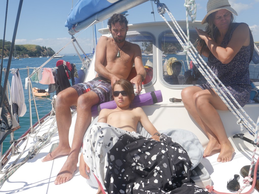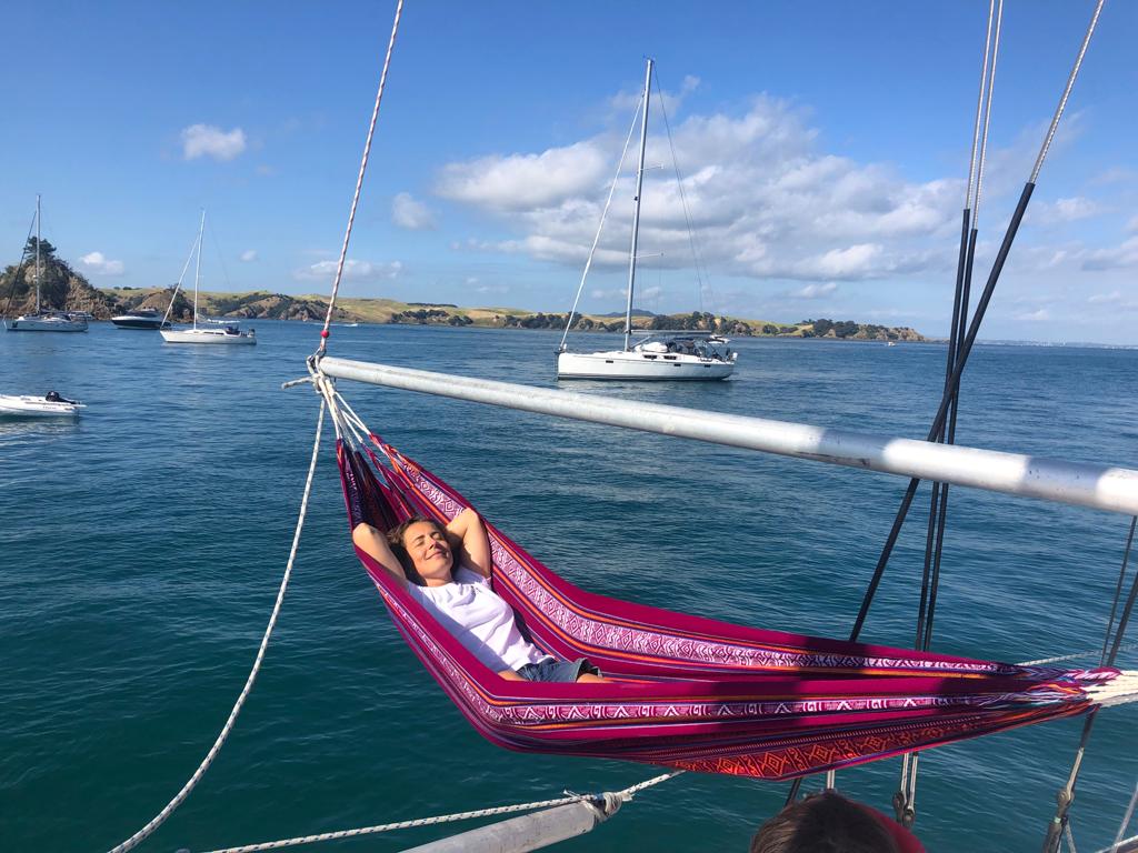 For breakfast I am offered crepes, Panettone and candles to blow, when I witness a group of teenagers jumping in the water from a hammock fitted on their yacht. Jealous, I mention the one we have onboard (bought some 15 years earlier in Otavalo market, Ecuador) but have never bothered to set up, and, magically, a few minutes later I am lazing around in my own boom-suspended hammock, soon joined by Azur for a big mother-and-son cuddle while the others go for a stroll on the beach.