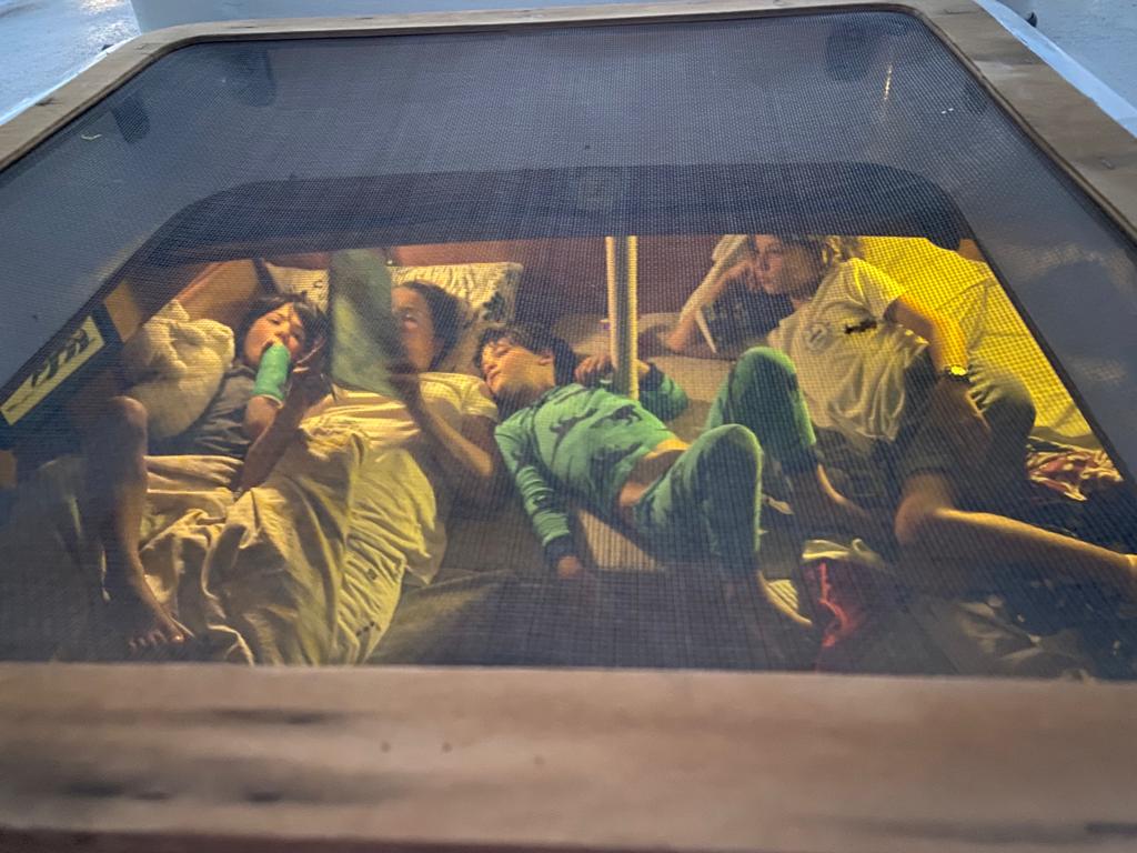 As the day comes to a close, and we’re winding down, cosy in the fully enclosed cockpit, sipping rum and umechu between grown-ups, loosely playing a game of Contrario, I look cheekily at the water and entertain the idea of a midnight swim. You guessed it, it doesn’t take long before we’re all in, frolicking naked in the phosphorescent plankton, merry at the sight of our under water sparkling trails.