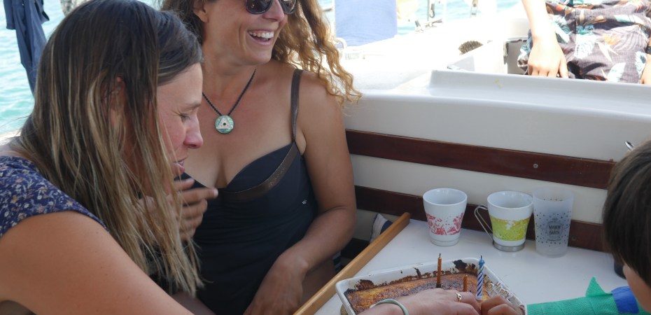 For breakfast I am offered crepes, Panettone and candles to blow, when I witness a group of teenagers jumping in the water from a hammock fitted on their yacht. Jealous, I mention the one we have onboard (bought some 15 years earlier in Otavalo market, Ecuador) but have never bothered to set up, and, magically, a few minutes later I am lazing around in my own boom-suspended hammock, soon joined by Azur for a big mother-and-son cuddle while the others go for a stroll on the beach.