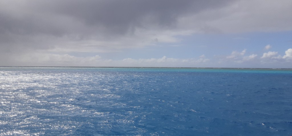 I’m the first to spot the whitewash of the waves crashing against the reef and Thomas keeps a close eye to spot the entrance of the pass which is, we’re glad to validate, very accurately chartered, and we make our way in, like a wriggly spermatozoon fecondating an ovum.