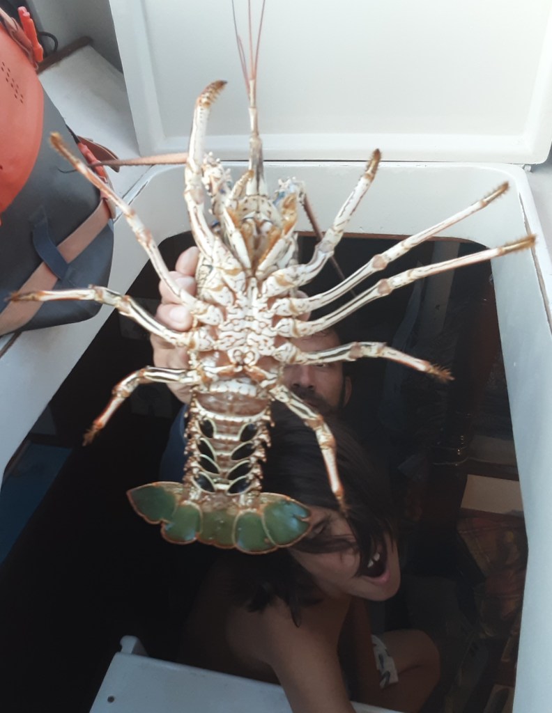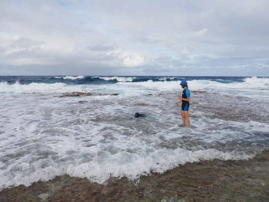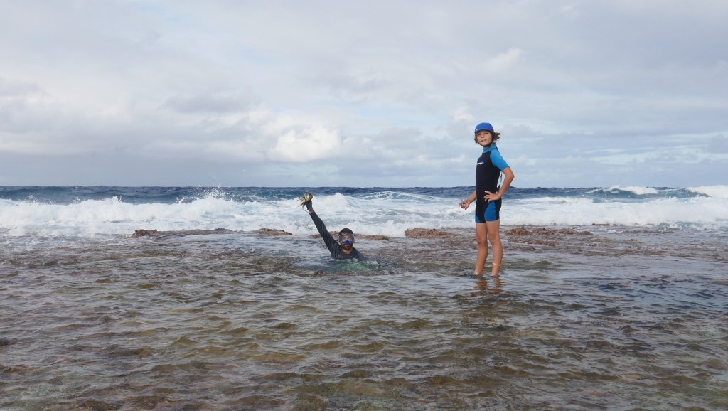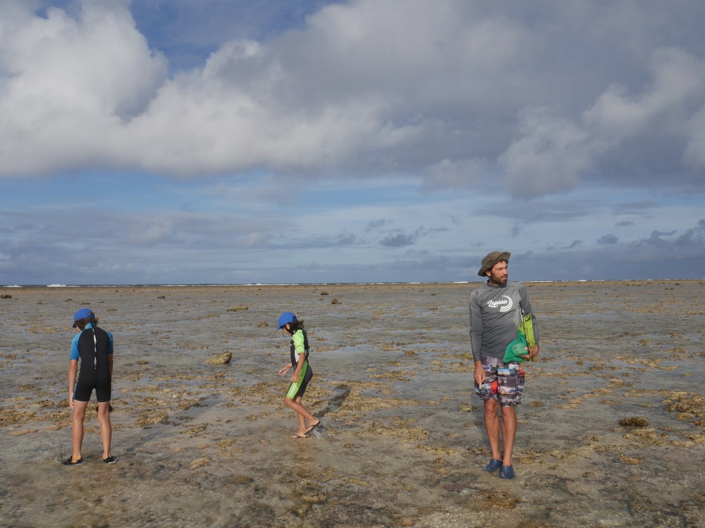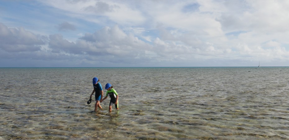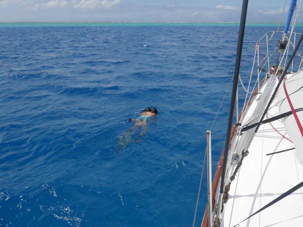 No boat on the horizon, the four-kilometre wide lagoon is ours and the water temperature reads 28 degrees! As soon as we’re anchored, we’re off swimming in our birthday suit in the bright blue water, the visibility is second to none. Thomas ventures to check out the anchor and survey the bottom, but returns shortly after announcing that Azur’s wish will be granted: swimming with sharks. I want to see, so I follow him but as soon as I glimpse the recognisable silhouette in the distance, thoughts about the recklessness of leaving our two children aboard in the middle of nowhere and risking our lives as shark food flood my brain and I promptly retreat to the safety of Obelix’ deck.