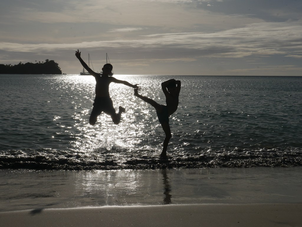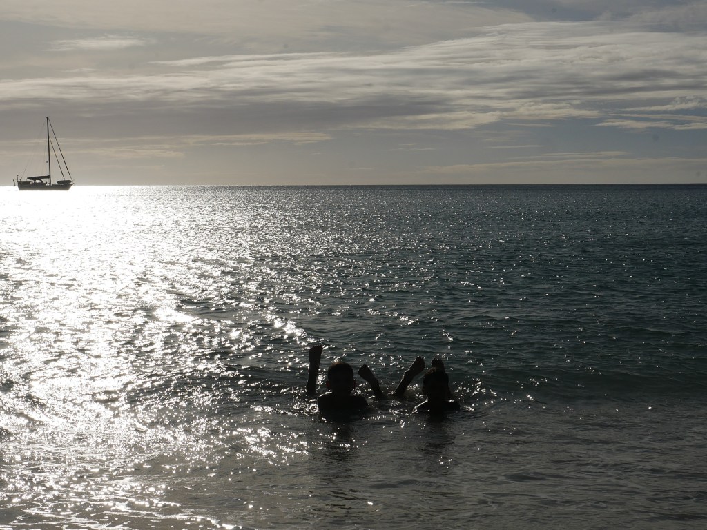 Cela aurait été dommage, car nous avons profité d’un après-midi de détente pour jouer dans l’eau, marcher sur la plage (ce qui nous a changé de nos innombrables baignades depuis le bateau) et observer les crabes.