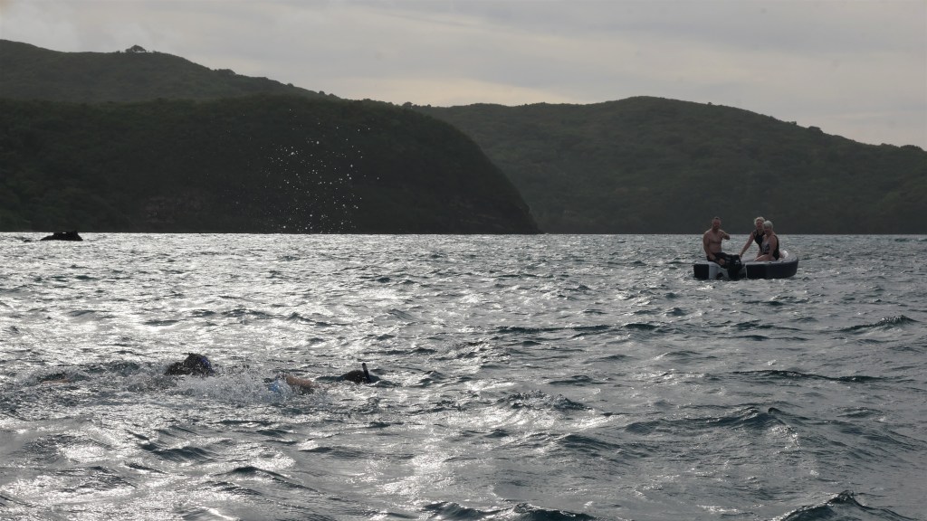 Nous nous asseyons sur la plage pour nous reposer et évaluer la situation : aucun signe de raies manta pour aucun d’entre nous, et, essoufflée comme je le suis, la perspective de répéter l’exercice pour une deuxième tentative ne me dit pas grand chose, quand un bateau à moteur du complexe touristique voisin passe en trombe et vérifie apparemment la zone. Peu de temps après, quelques autres bateaux chargés de touristes apparaissent, ce doit être l’heure des raies manta. Nous sautons tous les quatre dans l’annexe, résolus à rejoindre le groupe et à voir ce qu’ils voient. Les capitaines des bateaux scrutent l’eau debout dans leurs embarcations et indiquent l’endroit où se trouvent les raies. Et bientôt, nous et d’autres voileux à bord de leur annexes, les imitons en criant et en pointant du doigt dès que nous apercevons deux ailes pointues qui font surface au-dessus de l’eau. L’information est ensuite relayée du bateau aux guides et aux plongeurs pour le bénéfice de tous.