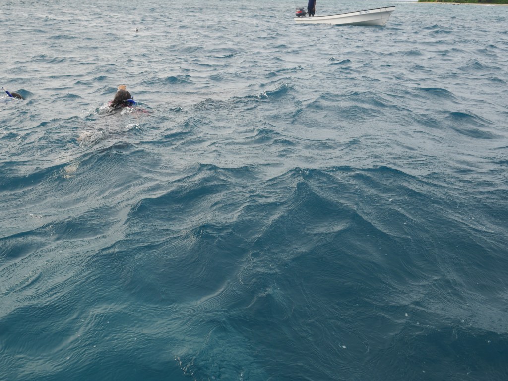 La densité et la variété des poissons et des coraux sont stupéfiantes mais la vitesse du courant l’est tout autant et j’ai franchement du mal à garder un œil à la fois sur Zéphyr, qui disparaît régulièrement en bas pour explorer les coraux et les poissons qui jouent à cache-cache, et sur la plage où nous avons laissé notre annexe, à la surface, qui arrive à toute allure. Mouvements de tête en haut, en bas, en haut, en bas, tout en poussant ou traînant Zeph et en me démenant comme une folle à contre-courant (sans palmes, les miennes étant cassées) pour arriver à la côte avant qu’elle ne soit hors d’atteinte. Je repère finalement un rocher qui émerge de l’eau non loin de notre but et je parviens à l’attraper et à assurer une position stable pour que Zéphyr puisse réajuster son masque. Il ne nous reste plus que quelques mètres à parcourir, mais le rocher est glissant et avec les vagues qui le caressent vigoureusement, ce n’est pas prudent de marcher dessus. Au lieu de cela, nous reprenons notre ascension sous l’eau, progressant en nous accrochant à chaque aspérité de notre mur d’escalade horizontal. Thomas et Azur sont un peu plus loin mais viennent vers nous apparemment sans aucune difficulté. C’est grace à leurs palmes, je me dis.
