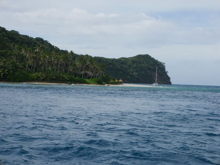 Nous sommes ancrés à côté de l’île de Drawaqa (qui se prononce Drawanga) et semblons être les premiers plongeurs sur l’eau, malgré un consensus parmi les plaisanciers sur le calendrier des raies manta qui, nous en sommes sûrs, se nourrissent deux heures avant la marée haute dans le passage de Drawaqa. Craignant que notre hors-bord de deux chevaux ne survive pas à la bataille contre le courant dans cette mince étendue d’eau, nous décidons de faire un premier plongeon en laissant l’annexe sur la plage faisant face à l’ouest, de marcher jusque de l’autre côté faisant face à l’est, et de nous mettre à l’eau là pour dériver vers notre point de départ. Chaque adulte est responsable d’un petit, Thomas avec Azur et moi avec Zéphyr.