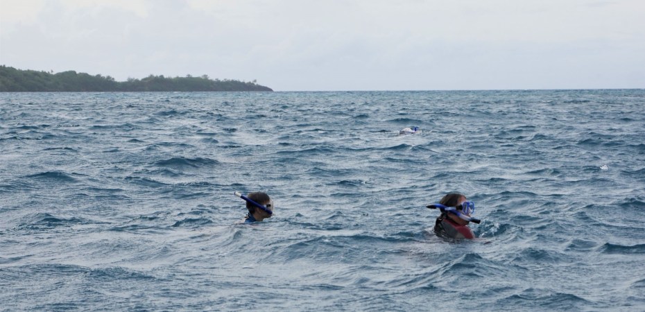 Nous sommes ancrés à côté de l’île de Drawaqa (qui se prononce Drawanga) et semblons être les premiers plongeurs sur l’eau, malgré un consensus parmi les plaisanciers sur le calendrier des raies manta qui, nous en sommes sûrs, se nourrissent deux heures avant la marée haute dans le passage de Drawaqa. Craignant que notre hors-bord de deux chevaux ne survive pas à la bataille contre le courant dans cette mince étendue d’eau, nous décidons de faire un premier plongeon en laissant l’annexe sur la plage faisant face à l’ouest, de marcher jusque de l’autre côté faisant face à l’est, et de nous mettre à l’eau là pour dériver vers notre point de départ. Chaque adulte est responsable d’un petit, Thomas avec Azur et moi avec Zéphyr.