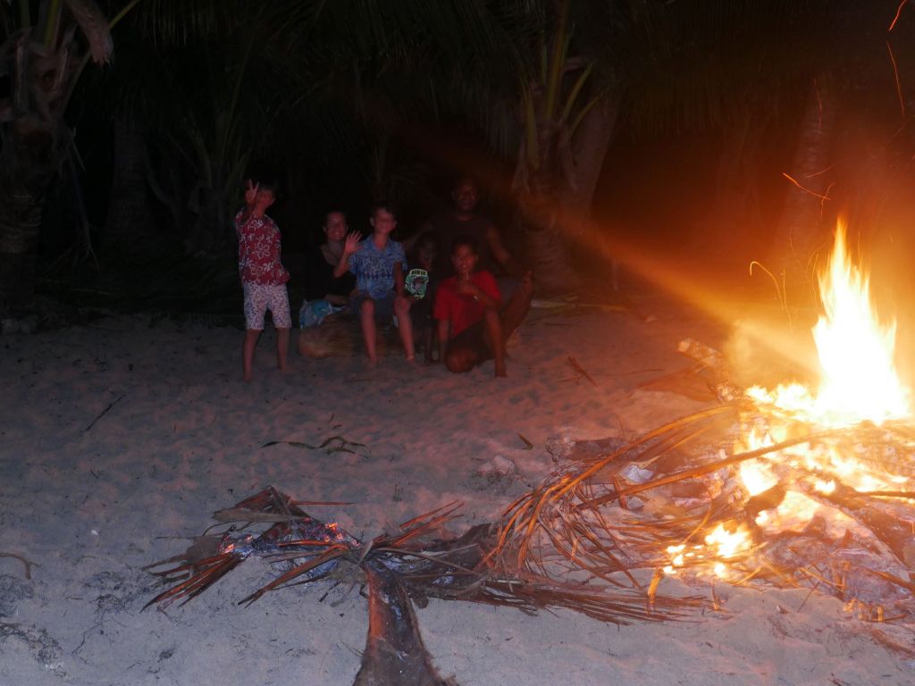 Dinner was followed by a bonfire on the beach where kids (locals and ours) couldn’t stop gathering banana leaves to excitedly watch them take fire in one go burning with huge flames, when not grilling marshmallows on a stick or watching Thomas do his popular fire juggling act, in an unusual cocktail of burnt candy and petrol smells.