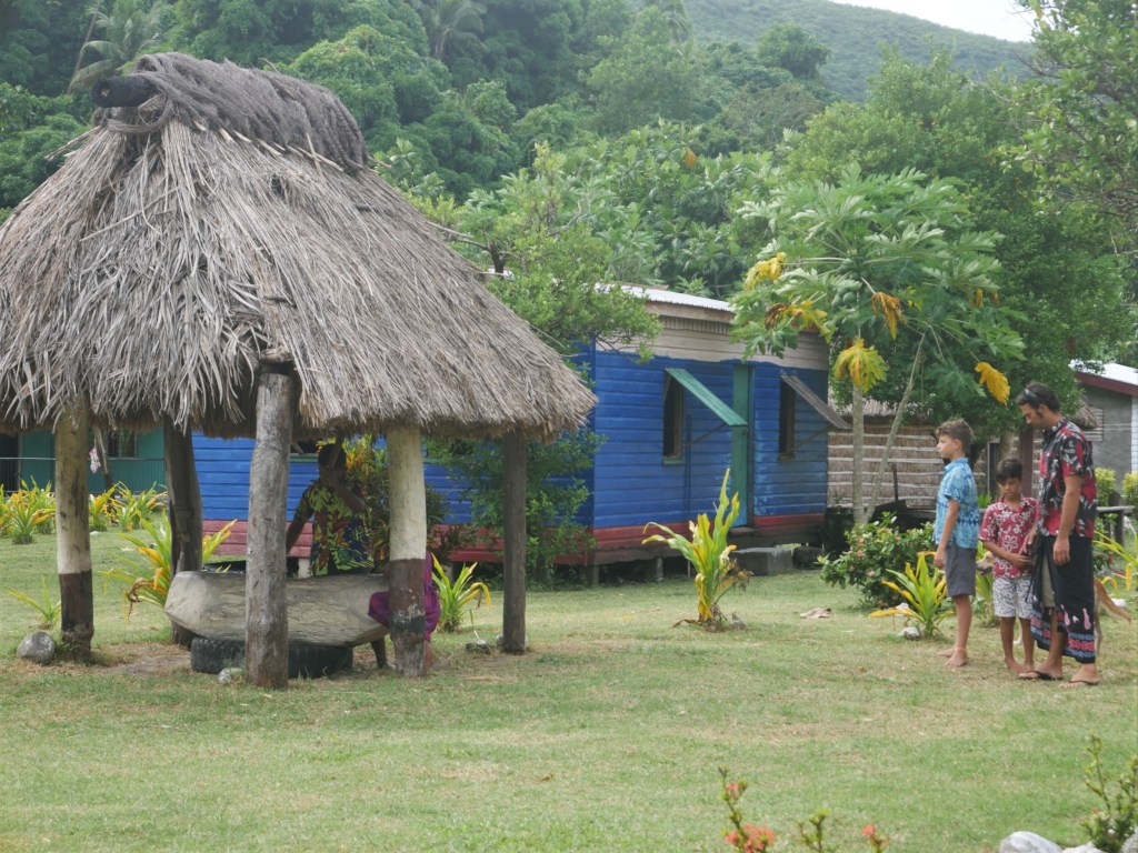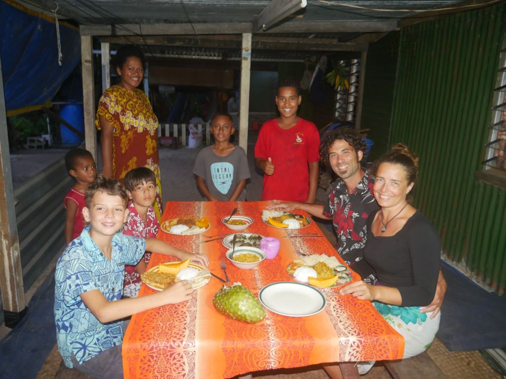 Invited to get a taste of local Fijian food by Ben, who explained to me how he had lost his job at the renowned Musket Cove resort due to tourism being halted by Covid in 2020, and how visiting yachties represented the main source of income for the village, we reported for duty the next day at his wife’s auntie’s house. We had to ask a fellow boat to exchange some of our NZD for FJD to afford the evening out and were wondering what to expect but determined to accept his invitation and do our bit to help. When I arrived, Thomas and the kids already knew the way as I had to do a second trip to the boat to get changed, having tripped and fallen in the water bum first on my first arrival by dinghy.