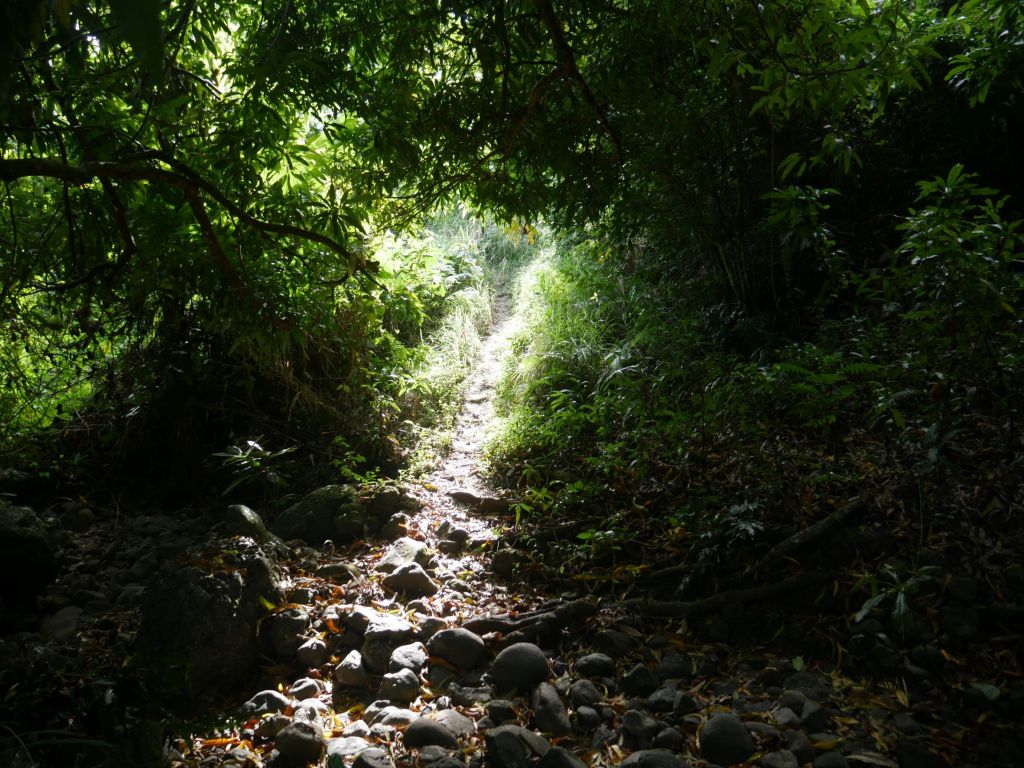 Second came the soundscape of a solitary hike* up the hill rhythmed by the ruffling of tall grass split to clear the path, dead leaves cracking under my steps, and squirming blue-tail lizards furtively escaping before me, followed by a scream, mine, when a villager appeared from nowhere, coming back from work the other side of the island, surprised my shooting the stunning view over the bay, and the sound of his machete chopping cassava branches to harvest the roots, in a sort of local pit-stop to the supermarket on his way home.