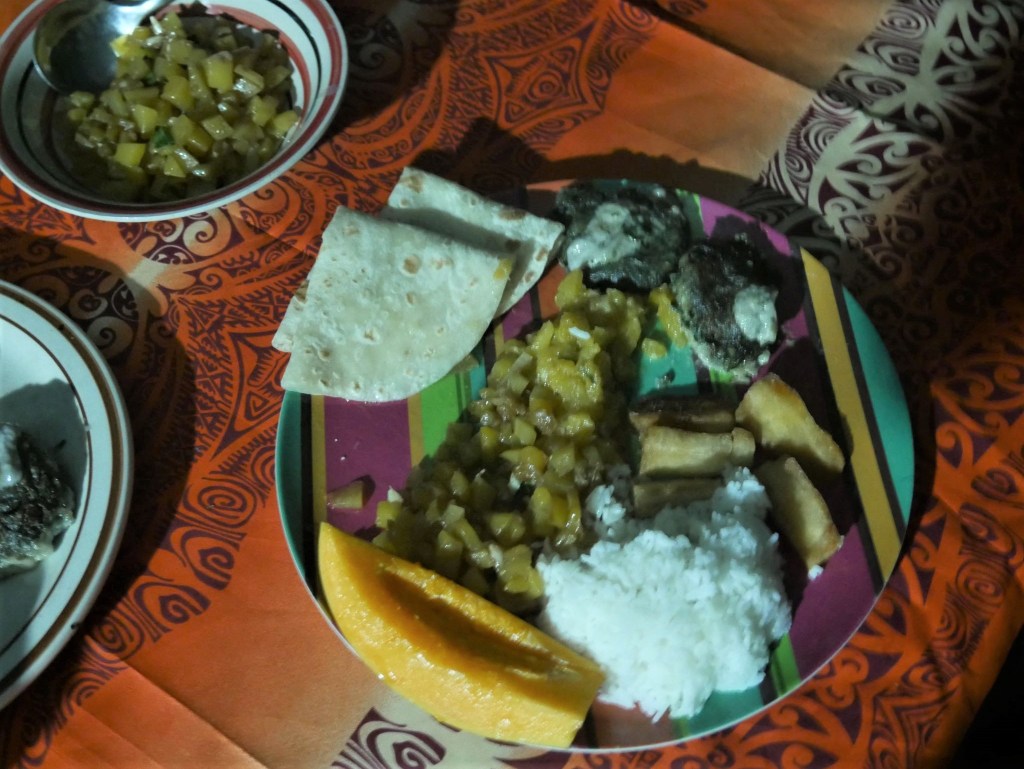 They had transformed their patio in a single-customer restaurant, and set the table for four with a bright orange sula fabric covering it. The plates displayed a colourful array of exclusively vegan and local Fijian dishes including rice, roti, cassava chips (a hit with the kids), curried pumpkin, curried pawpaw, taro leaves and coconut cream fritters, and fresh pawpaw slice. A feast for our tastebuds between the tangy and slightly bitter taro leaves and the spicy pumpkin cooked with garlic onions and curry leaves, the sweetness of the pawpaw in its two forms. I regretted having had a muesli bar for afternoon tea as I wish I could fit more in my delighted stomach, but had to share some of my roti with Thomas who wouldn’t waste any scrape of food.