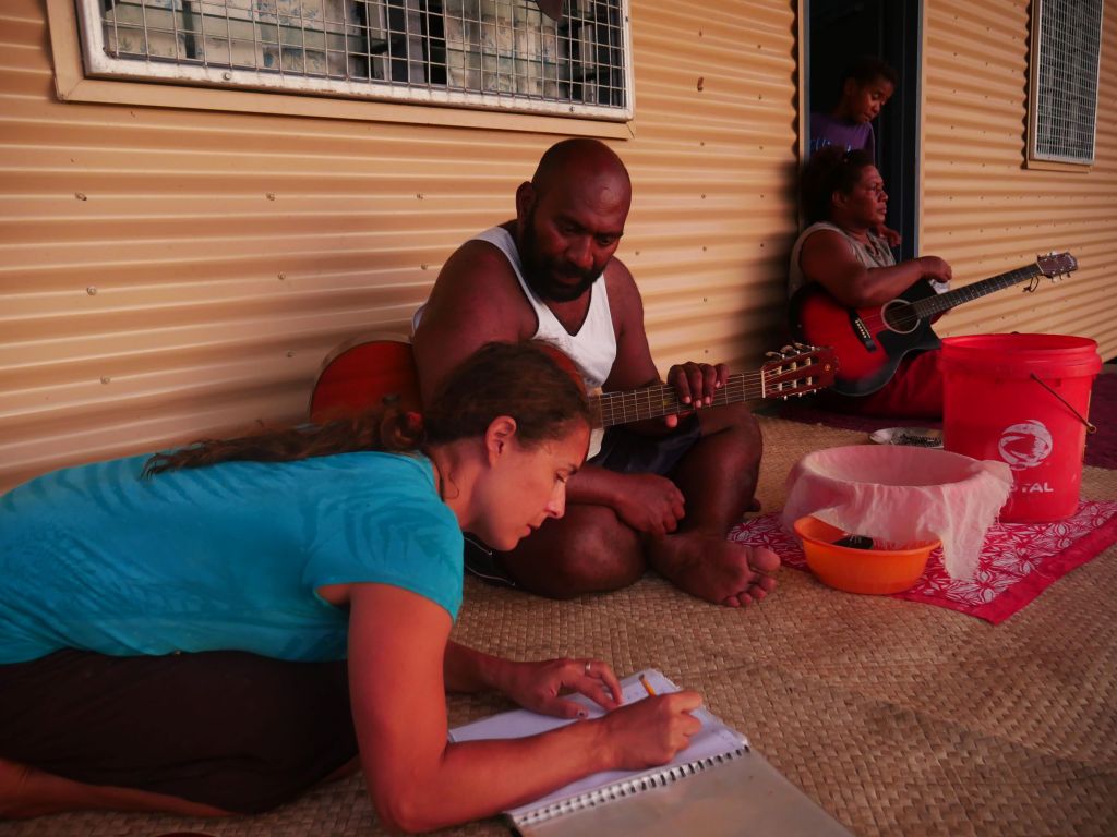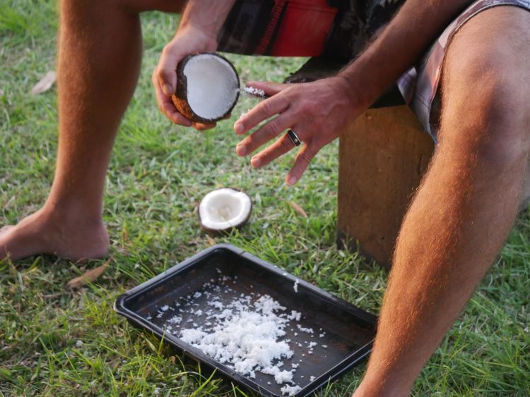Êtant un centre géré par le gouvernement, avec des travailleurs embauchés comme habitants, et pas un village traditionnel avec un chef et tout le protocole qui va avec, nous n’avons pas offert un cadeau de kava pour un SevuSevu formel, la “taxe de bienvenue” comme nous, Occidentaux, pourrions l’appeler. Au lieu de cela, nous avons apporté un gâteau et un peu de chocolat pour remercier Mere, une jeune mère de deux enfants de cinq et un an et demi, pour tous ses conseils sur les façons de cuisiner la papaye, avec les papayes pour aller avec (que nous avons fait comme salade et curry), et son mari Pau pour la leçon de décorticage et rapage de noix de coco, avec les noix de coco pour aller avec (qui a produit le lait pour le curry). Mais le chocolat a vite disparu dans les mains d’un grand costaud barbu, comme le gâteau (à la banane) a disparu dans les mains des enfants, fraîchement débarqués de l’école. Tout le monde rit beaucoup, alors que nous demandons les noms des trois femmes assises sous le manguier avec nous, et que les enfants tournent autour du moule à gâteau comme des abeilles autour de leur ruche. Comme on parle surtout fidjien, j’éprouve ce sentiment gênant de ne pas savoir si l’on rit de nous ou pas du tout, et je continue à sourire poliment. La gêne ne s’attarde pas pour autant, car les rires sonnent bienveillants, et tout est beau dans la lumière de la fin d’après-midi, et bientôt la tranquillité de tout cela m’apaise et je profite de l’instant présent.