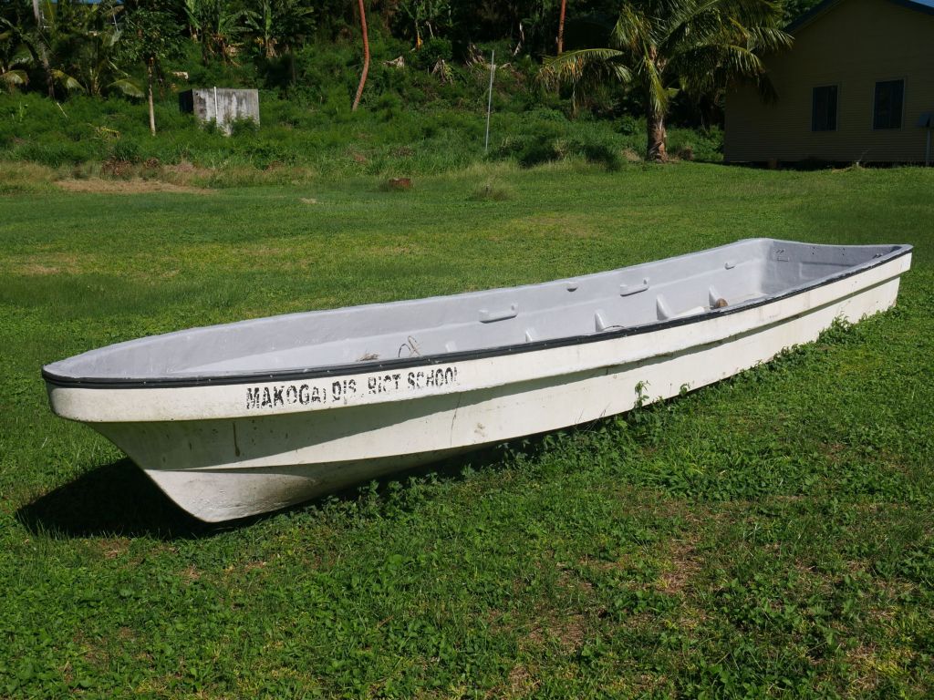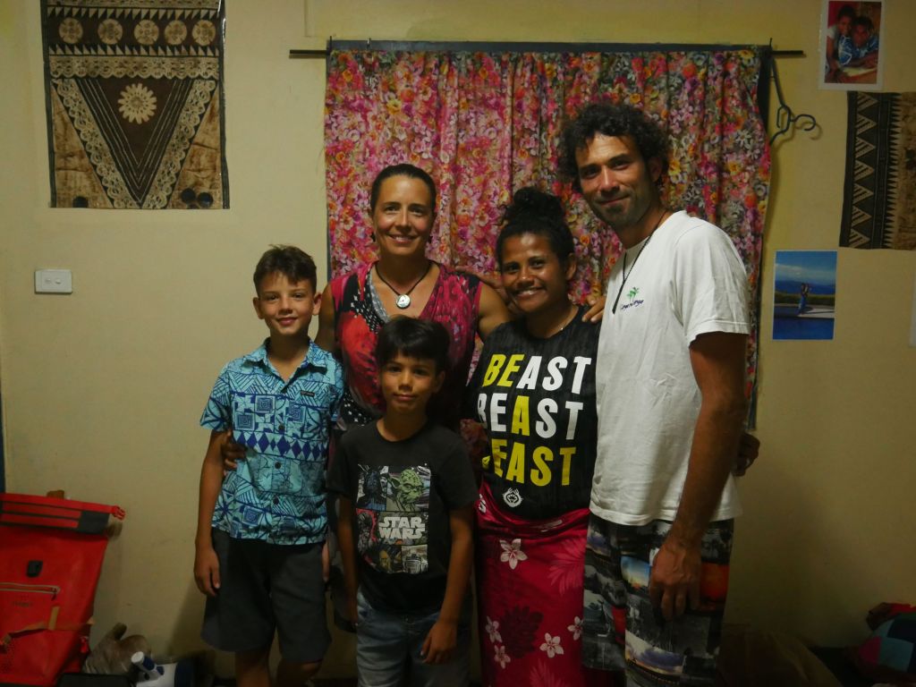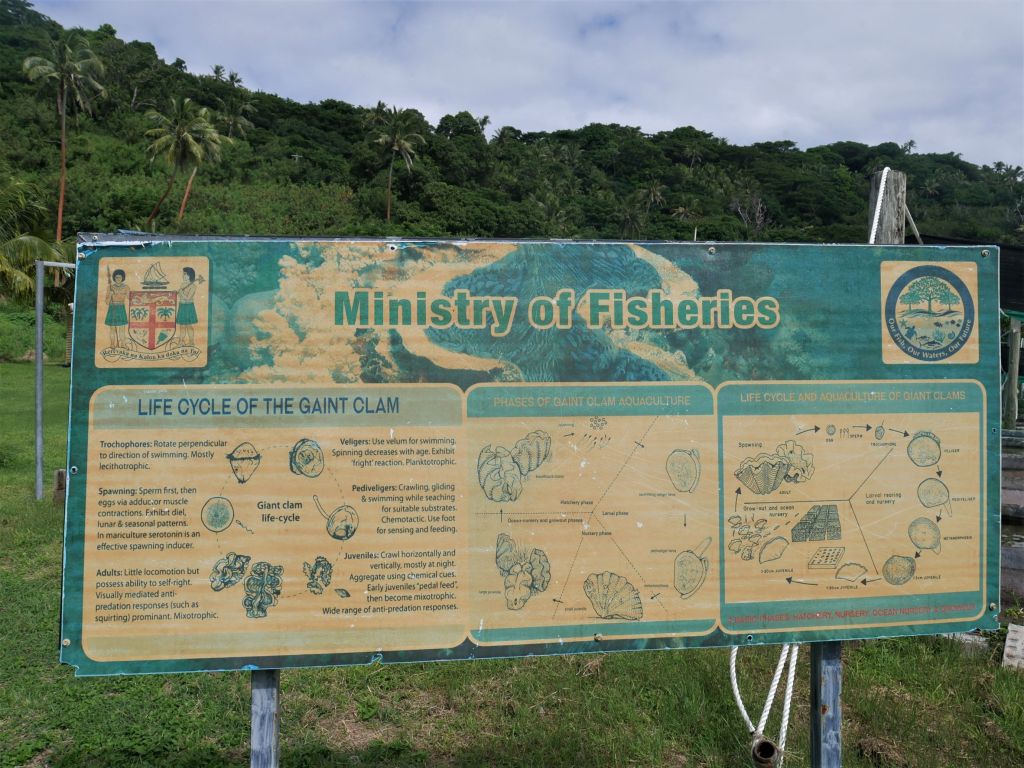 Nous sommes arrivés à Makogai (à prononcer Makongaï) hier, suivant les conseils de l’équipage de Vivace, espérant que, comme leur fille Tia il y a quelques années, nos garçons auraient l’occasion de s’occuper des bébés tortues. Mais de tortues il n’y en avait plus car nous avons appris que c’était trop de travail, mais qu’il y avait des palourdes géantes juste à côté du quai si nous voulionsaller y nager. Nous avons continué la visite des bassins de reproduction des palourdes avec Enoke, un homme usé par le temps, à 2 ans de la retraite à 55 ans, mais qui a l’air d’avoir 20 ans de plus, avec peu de cheveux et encore moins de dents, ce qui m’a fait penser à Tavae, ce pêcheur tahitien qui a été emporté par le vent et a survécu 118 jours en mer uniquement grâce au poisson et à la foi (un livre que ma grand-mère m’a offert quand j’étais adolescent). Il demande soudain : “Quelqu’un vous a t’il amené au cinéma ?” Et je pense qu’il s’agira d’une salle de projection avec un film expliquant le cycle de vie des palourdes et des tortues, mais nous partons dans la brousse. Le “cinéma” s’avère être une ruine envahie par la jungle. Seules les parties bétonnées sont visibles, la salle de projection, le sol et la “scène” devant l’écran. Il s’agit d’un vestige du centre de lépreux qui a accueilli 5000 personnes entre 1911 et 1969, bien équippé avec un barrage fournissant l’eau et l’électricité et une route vers le village de l’autre côté de l’île. Aujourd’hui, tout cela est envahi par la nature, qui efface le passage de l’homme, sauf les dernières habitations qui ont été reconstruites après le passage du cyclone Winston, une autre force de la nature qui sévie sur la région, et qui a rasé les quelques maisons des travailleurs du parcs à palourdes et de leurs familles. Le cyclone a peut-être été un mal pour un bien, car ils bénéficient désormais d’une construction en béton et en acier financée par la solidarité internationale, de panneaux solaires alimentant les réfrigérateurs la nuit, alors qu’auparavant le générateur fonctionnant toute la journée pour alimenter les pompes des bassins à palourdes était la seule source d’énergie, et que les nuits sentaient les lampes à kérosène. Le luxe de la civilisation va et vient dans cette baie, depuis les hauts du centre de Lépreux, jusqu’au bas pré-Winston, et le milieu d’aujourd’hui, avec même la réception du téléphone cellulaire si vous êtes sur le bon réseau et faites une randonnée d’½ heure jusqu’au sommet de la colline 😊
