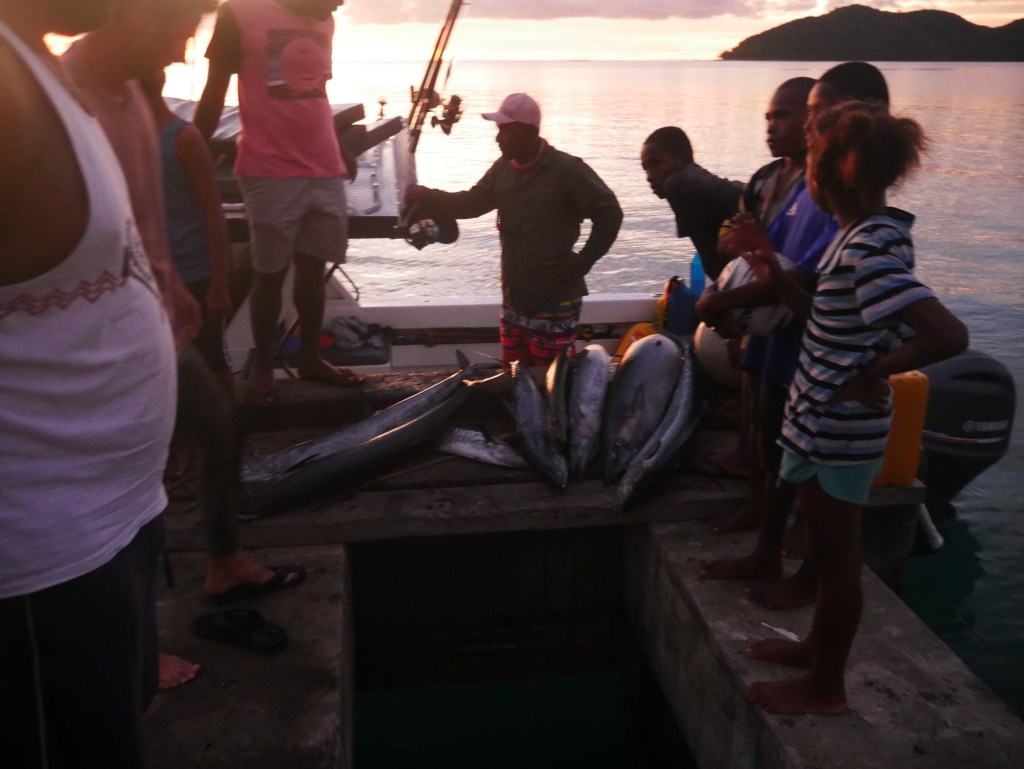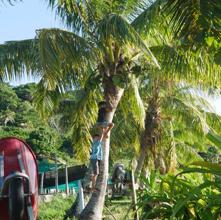 Aujourd’hui, nous avons essayé de grimper la petite colline derrière le village. Cela semble être une marche de 15-30 minutes. Nous demandons notre chemin à Mere Mere, qui nous dit que c’est tout envahi par la végétation et que cela prendrait environ 1 heure. On nous dit juste de viser le grand manguier près des trois cocotiers, puis de tourner… dans quelle direction déjà ? Pas de pantalon long, pas de chaussures fermées, pas de chaussures du tout pour moi (Thomas), pas de machette… Plusieurs heures plus tard, nous sortons enfin de la jungle, à la base des hautes herbes et des rochers qui forment la dernière partie de la montée, beaucoup plus verticale de près qu’elle ne l’était depuis la plage. Lorsque nous redescendons enfin (pas de piste pour monter veut dire pas de piste pour redescendre non plus !), en sueur, gratants, couverts de coupures et d’épines, nous accueillons la fraîcheur de l’eau, même si le sel pique. Comme il n’est pas trop tard dans la journée, j’en profite pour aller faire une mission de chasse sous-marine sur une grosse tête de corail profonde au milieu de la baie, et je ramène un poisson rouge d’environ 40cm de long avec de gros yeux globuleux, et de méchants dards sur les joues, avec lequel le coquin a poignardé mon index ! Lorsque je l’ai ramené sur le rivage pour demander aux habitants s’il était bon à manger et si je devais m’inquiéter de la piqûre, ils m’ont confirmé qu’il était bon à manger et que j’allais avoir mal et être engourdi pendant quelques heures, mais que je n’aurais pas besoin de me couper le doigt, quel soulagement ! Juste à ce moment-là, un bateau arrive et décharge une tonne de matériel, ainsi que quatre saoudiens et leurs guides australiens et fidjiens qui sont venus ici pour la pêche sportive, mais pas comme vous la connaissez, en chasse sous-marine de gros poissons du large ! Ils parlent de thon à dents de chien et de quel poisson se battra le mieux, excités qu’ils sont après avoir pris l’avion jusqu’à l’autre bout du monde pour tenter pendant huit jours de tirer “la prise de leur vie”, ce qui rappelle la façon dont les colonialistes pouvaient parler autrefois des lions et des rhinocéros. Ces poissons très communs d’aujourd’hui deviendront-ils les espèces en voie de disparition de demain ?