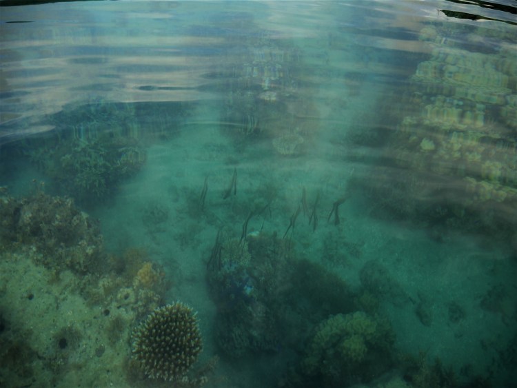 Après la visite du village, nous sommes allé nager à coté du ponton, et en effet, le turquoise vif d’une palourde n’avait d’égal que la profondeur de l’indigo de l’autre. Elles ne sont pas géantes ( a peu près la taille d’une pastèque), mais elles sont vivantes et belles, et nous pouvons imaginer, à partir de la coquille blanchie de la défunte parente géante qui se tient près du bassin, ce que cela doit être d’en rencontrer une dans la nature. Quelques jours plus tard, un garçon nous demande si nous avons vu les géantes. Et voilà, à quelques mètres de là où nous regardions, un spécimen qui pourrait vous attraper le pied comme dans un album de Corto Maltese. Il n’est pas aussi beau que les plus petits, mais ses lèvres apparemment brunes se révèlent d’un chaud orange doré lorsqu’on l’observe de près, et en jetant un coup d’œil à l’intérieur de la fente, on peut voir les rangées de filtres, d’un blanc éclatant, et au centre un “œuf” brun et orange lumineux. Vu à cette taille, il semble beaucoup plus animal que sa coquille extérieure, ressemblant plus à de la pierre qu’à un être vivant.
