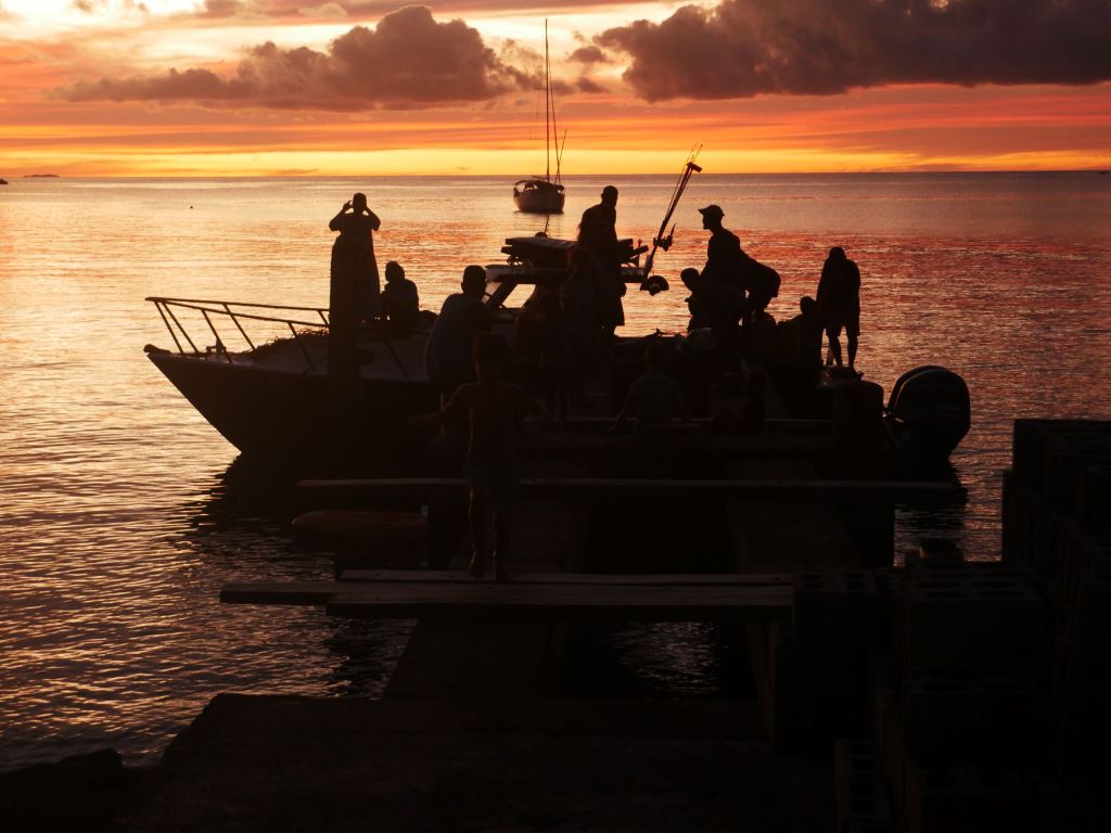La racine de yaqona est mise de côté au profit d’un sachet de poudre pré-moulu (comme du café moulu au lieu de grains), qui est tout simplement filtré dans de l’eau fraîche. Pau remplit une ½ noix de coco servant de bol, le buveur applaudit le premier, le reçoit avec un “bula”, puis le boit cul-sec, et tout le monde applaudit deux ou trois fois, avec cette façon particulière qu’ont les Fidjiens d’applaudir avec les mains en coupe. Le goût n’est pas aussi mauvais que celui de la boue, comme on me l’avait décrit. En fait, ça n’a pas beaucoup de goût. Ce n’est ni particulièrement agréable ni désagréable. Ca laisse une sorte de picotement dans la bouche, comme la menthe poivrée. Peut-être un peu d’engourdissement, mais peut-être que certaines personnes y sont plus sensibles que d’autres (Salomé a dit qu’elle se sentait comme chez le dentiste !). Nous buvons une tournée et parlons, apprenant à nous connaître. Qui vient d’où (c’est ainsi que j’apprends les origines du Chef), et comment ils se sont rencontrés (Peter, le guide de plongée fidjien est un ami d’enfance de Pau), etc… Quelques minutes plus tard, une autre tournée, et ainsi de suite. Relativement tôt, les plongeurs vont se coucher, prévoyant de partir au lever du soleil pour leur tentative de “prise de leur vie”. Je reste et continue à bavarder, en essayant d’apprendre quelques mots de fidjien, et en découvrant quelques histoires locales, comme ces deux tribus, l’une ayant le contrôle sur les poissons, l’autre sur les cochons, et si vous ne demandez pas la permission avant de manger de l’un ou l’autre, vous risquez de vous étouffer et seul un membre de la tribu concernée peut vous sauver, personne d’autre n’essaierait même de vous aider.