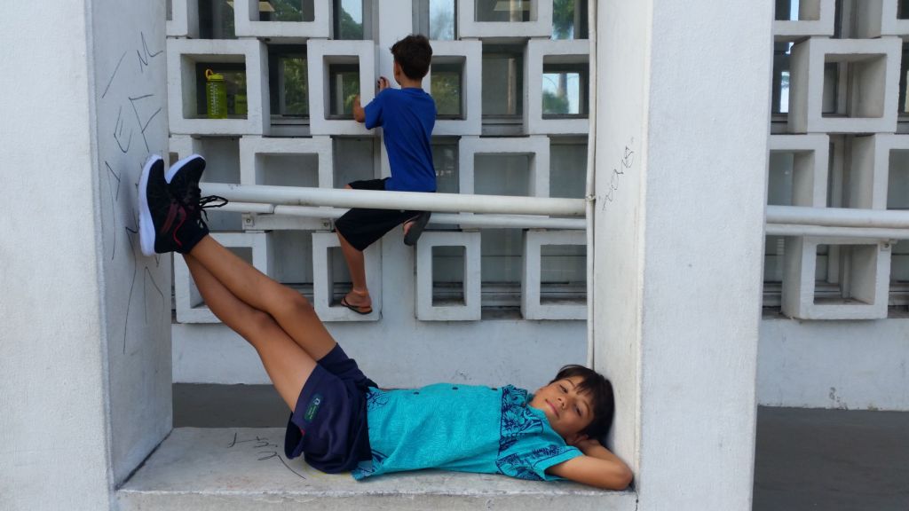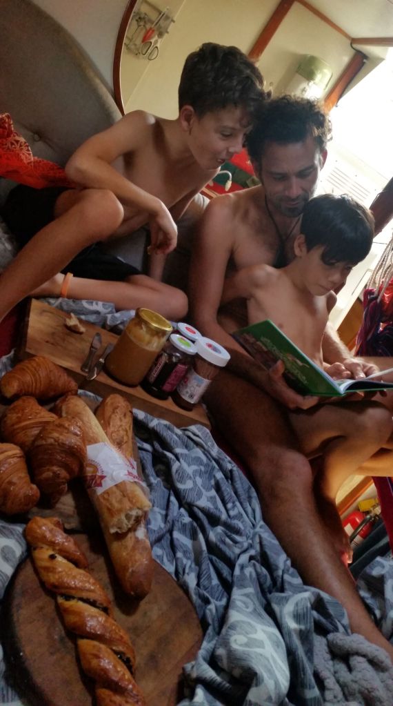 Nous arrivons à Port Moselle à l’heure du déjeuner et prenons le temps de faire un pique-nique avant de nous présenter à la Capitainerie (Sodemo). La dame en charge est très serviable et nous aide à remplir les différents formulaires requis et nous donne un bon pour une boisson au restaurant voisin, Le Bout du Monde, qui souhaite accueillir les marins venus de loin. Dommage, les services d’immigration ne sont pas ouverts l’après-midi et nous devrons attendre le lundi pour faire tamponner nos passeports. Heureusement, nous pouvons débarquer après que l’agent de biosécurité nous a rendu visite et nous a demandé de jeter tous les produits frais restants. Inutile de dire que dès que nous avons le feu vert, nous allons en ville pour nous dégourdir les jambes, visiter la Place des Cocotiers et la bibliothèque publique (où un bibliothécaire métisse très gentil nous explique les coutumes et croyances locales), avant un dîner de fête au Bout Du Monde. Les gens ont l’air familiers, ils parlent français et sont habillés élégamment, ce qui me fait presque pardonner qu’ils fument autant. Les enfants commandent une pizza, Thomas des magrets de canard et moi une bavette à l’échalotte avec des frites et des légumes. C’est tellement bon ! Ca fait du bien d’être ici ! Mais Azur en veut plus et demande un film. Il plaide, il supplie jusqu’à ce qu’on trouve un accord : Ils peuvent regarder un film mais la prochaine fois qu’ils en veulent un, ils devront avoir parlé au moins 80% de français pendant trois jours consécutifs. Après délibération avec son frère, Azur tend la main vers moi avec un sourire, “On accepte !” De retour au bateau, Thomas lit à haute voix un message de nos amis Laurent, Sandrine et leur fils Thomas, 11 ans, qui sont venus nous saluer. Nous allons immédiatement à leur rencontre et les invitons à bord, si heureux que les garçons aient un ami avec qui jouer et, nous, d’autres adultes à qui parler. Nous ne pouvons nous empêcher de montrer aux enfants des photos de Zéphyr et Thomas (Junior) prenant un bain ensemble, il y a dix ans, lors de notre dernière visite, quand Azur n’était qu’une petite graine attendant d’être fécondée le dernier jour de notre voyage. Le succès de notre première journée à Nouméa est complet, et pourtant, c’est vendredi soir et je sais qu’il y a une fête latino dans les environs… Alors, dès que nos ami s’en vont, Thomas m’aide à sortir le vélo électrique pliable de la cabine cagibi, et je file au Code Bar à l’Anse Vata pour aller danser la salsa, la bachata et la kizomba jusqu’à juste avant minuit. En rentrant à Obélix, je sens l’air me caresser le visage, c’est l’hiver ici et il fait nettement plus frais qu’aux Fidji, je porte un jean et ma veste “Rêve” avec ses broderies dans le dos, je m’imprègne des sentiments intenses de fierté et d’épuisement. Je me sens si vivante. Le matin, Thomas nous offre un petit-déjeuner au lit avec des baguettes, des croissants et des pâtisseries fraîches.