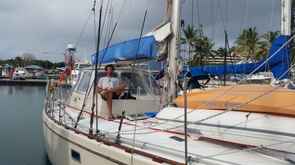 Comme les prévisions se confirment, et qu’un creux arrive avec de forts vents de Sud-Ouest qui vont gêner notre progression dans la dernière ligne droite, nous décidons d’empanner et de pointer vers Maré, l’île Loyauté la plus au sud, pour y attendre avant de reprendre notre route vers Nouméa. Thomas allonge son quart pour y arriver et arrêter le bateau, le laissant dériver assez loin de la côte pour le reste de la nuit. Je prends le relais et vais dormir dans le cockpit pour les dernières heures avant le lever du jour. Quel réconfort que que de voir la terre qui nous accorde une mer plate et un abri contre le vent, nous rendant à nouveau pleinement opérationnels, avec un cerveau qui pense, et une volonté qui n’est pas réduite à néant. Et comme il est doux d’être salué une fois de plus par un groupe de dauphins dansant autour du bateau ! Initialement en Baie de l’Allier, il y a encore un peu de houle, donc au matin, nous décidons de nous relocaliser dans la Baie de Waeko. La baie est parfaitement abritée de la houle et du vent et possède également un comité d’accueil de dauphins. Nous avions envoyé un e-mail à la douane de Nouvelle-Calédonie pour demander si nous pouvions nous y arrêter pour réparer notre regulateur d’allure, mais n’avons toujours aucune réponse après une journée. Qui ne dit mot consent, nous jetons donc l’ancre dans cette baie apparemment déserte, avec de hautes falaises qui me rappellent Etretat en Normandie, et de grands pins éparpillés le long de la côte, qui ressemblent de loin à des gratte-ciel isolés. Avec les jumelles, nous pouvons repérer ce qui semble être un kayak et un chemin qui va du haut de la falaise jusqu’à la mer, mais personne en vue. La visibilité est incroyable. Nous ouvrons les yeux dans l’eau quand quelqu’un saute dedans pour voir les bulles créées dans son sillage. Azur est si heureux de pratiquer ses plongeons et son apnée une fois de plus. Et bientôt les garçons partent faire de la PMT (palme masque tuba) tandis que je me repose, terminant mon troisième livre lu pendant cette traversée, En attendant Bojangles, après deux nouvelles d’Amélie Nothomb. Nous prenons une douche, nous nous sentons frais et dispos pour attaquer la dernière étape, 115 miles nautiques seulement nous séparent de Nouméa. Nous partons le lendemain en milieu d’après-midi, pour faire la plus grande partie de la traversée de nuit et arrivons au Canal de la Havane avec la marée montante et le soleil levant. Avec des vents de 20 nœuds oscillant entre 80 et 100 d’angle, ce n’est pas la nuit la plus reposante, mais nous arrivons à l’heure et à l’aube, le vent est tombé, nous obligeant à allumer le moteur, trop pressés d’arriver en ville avant midi et de remplir toutes les formalités administratives avant que l’administration française ne ferment pour le week-end.