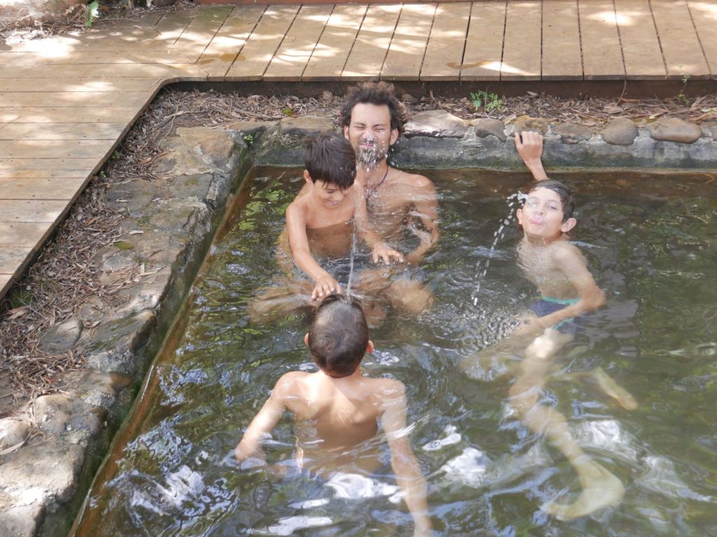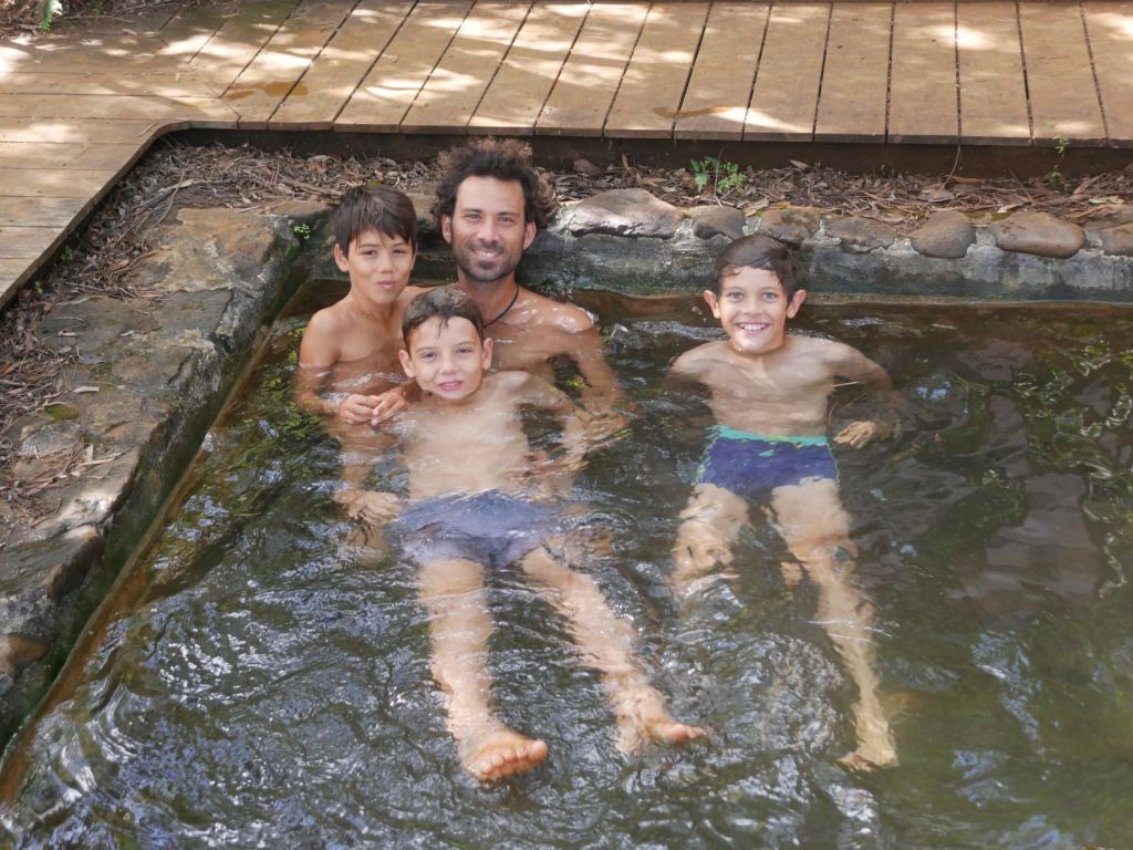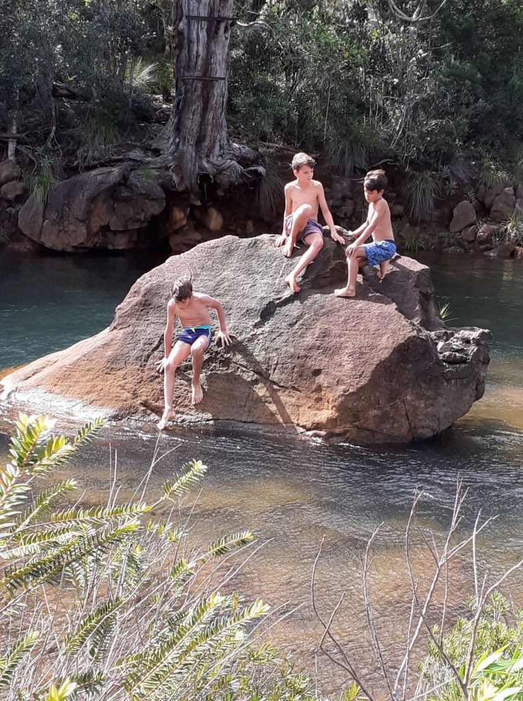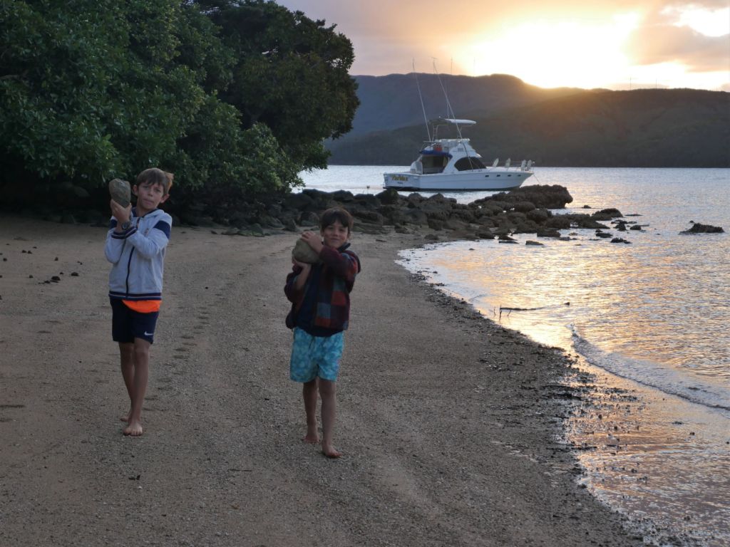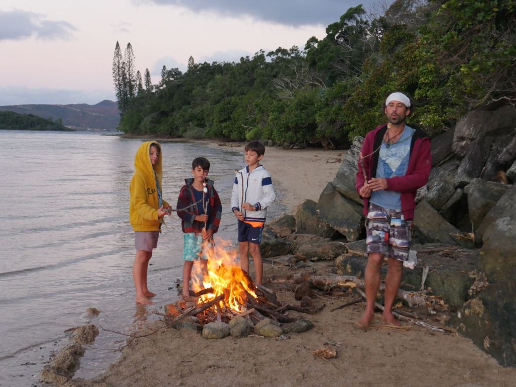 We then relocated to Baie des Kaoris for our second night and the next day ventured by foot in the bush to reach a tiny thermal pool also called the“Japanese Pools“, where we met one of Azur’s schoolmates, Loucas. The hot pools were rather tepid than hot, and quite crowded due ot the holidays (Thomas and Laurent were gloating that during the lock-down, they had it all for themselves), but very enjoyable after a dip in the cool river. On our way back we stopped to have a skinny dip and natural shower in the river (where we were alone) before having a late lunch at the boat and relocating one last time to Ilot Casy. There we made an illegal fire on the beach to roast marshmallows for the kids’ delight, and throw Thomas’ popular fire dance for the few boats moored around.