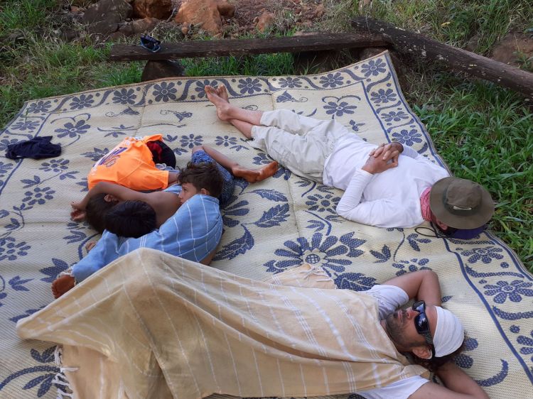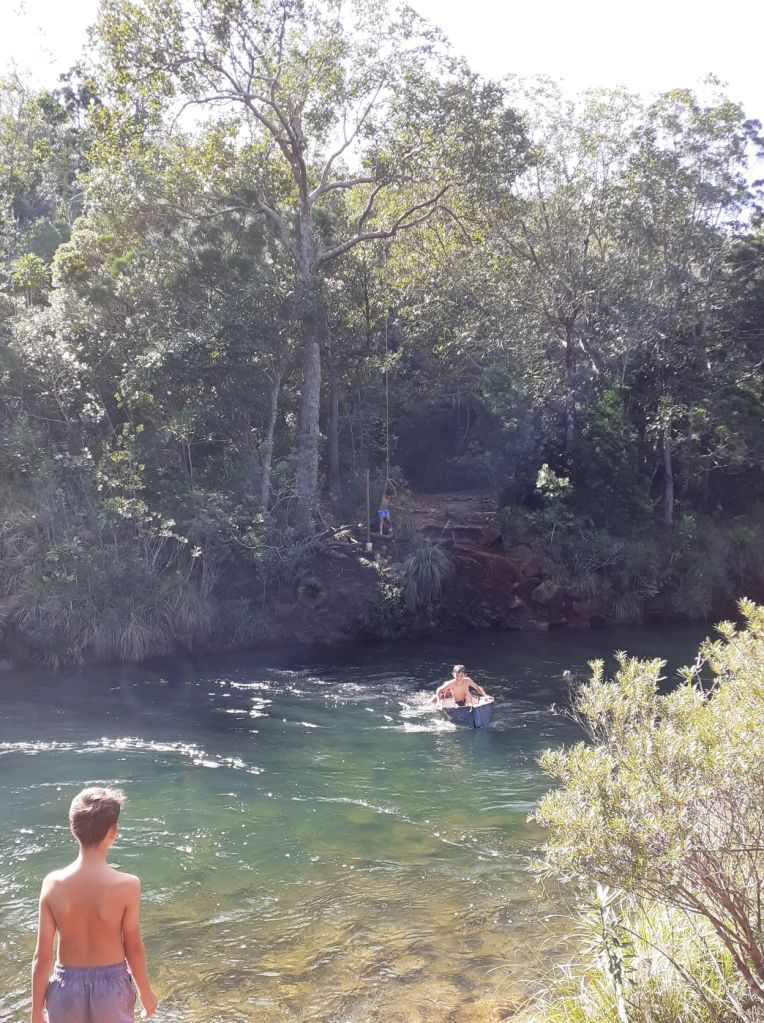 On the second day we rowed our way up river and against tide in dinghy, kayak and SUP to a nice swimming hole by an isolated house and spent the day there swimming, jumping from the rope, and trying our luck at surfing on the body board secured to a rope across the river,. A picnic ensued on the table set up by the owner of the house, who came out to give us a mat for our afternoon nap!