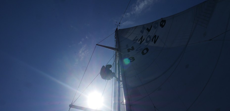 Après trois jours de navigation presque exclusivement au moteur à 285 degrés en direction de l’île du Timor, la dernière nuit, à seulement 60 miles de notre objectif, alors que nous pensions que rien ne pouvait se passer d’ici notre arrivée imminente le lendemain matin, un vilain grain nous a cueilli comme des bleus et a provoqué une montée d’adrénaline monumentale et des dégâts matériels, nous coûtant une drisse de génois, plusieurs déchirures dans le génois, une chute de grand-voile déchirée et quelques coutures arrachées, et un pan de l’auvent du cockpit à recoudre. Ce n’est pas qu’il n’y avait pas de signes avant-coureurs, et que Dieu a essayé de nous avertir du mieux qu’il pouvait, mais d’une manière ou d’une autre, nous avons réussi à rester inconscients. Comme lorsque le spectacle d’éclairs dont nous avions été témoins chaque nuit s’est intensifié et nous a completement cernés, oh bien, nous avons eu ça chaque nuit et rien de mauvais n’est arrivé. Ou lorsque j’ai senti des gouttelettes de pluie lors d’une journée autrement aride, j’ai simplement fixé l’auvent du cockpit arrière en pensant que cela suffirait à nous protéger du crachin. Ou lorsque j’ai observé, sur le traceur de cartes, que le Yukon, le bateau qui nous suivait depuis Darwin, avait modifié sa trajectoire de 20 degrés vers l’ouest et que j’ai fait part de mes observations à Thomas qui a considéré qu’il s’agissait d’une autre inexactitude du système AIS. Ou enfin, lorsque le vent a augmenté régulièrement de 12 à 20 noeuds, et que je criait chaque fois que la nouvelle vitesse était de 2 nœuds supérieure à la précédente, jusqu’à ce qu’il passe de 20 à 25 ou 30 en quelques secondes et que Thomas ait enfilé son harnais et sa longe, sur son corps tout nu, pour sortir et réduire les voiles, 40 nœuds les remplissaient et le génois ne voulait pas s’enrouler, ni la grande voile s’affaler. Le cockpit était alors complètement exposé à la bourrasque et nous étions trempés, Thomas à l’extérieur, moi à l’intérieur, balacant tous les objets que je pouvais attraper aux enfants en bas pour qu’ils les rangent, coussins, squabs, kindle, ordinateur portable, etc, avant de fermer l’écoutille de la cabine pour qu’elle reste sèche. Mais j’avais presque l’impression d’abandonner les enfants qui se demandaient ce qui se passait sur le pont. De temps en temps, je leur criais des mots rassurants (après leur avoir demandé de tout attacher pour éviter que les choses ne tombent à chaque empannage intempestif).