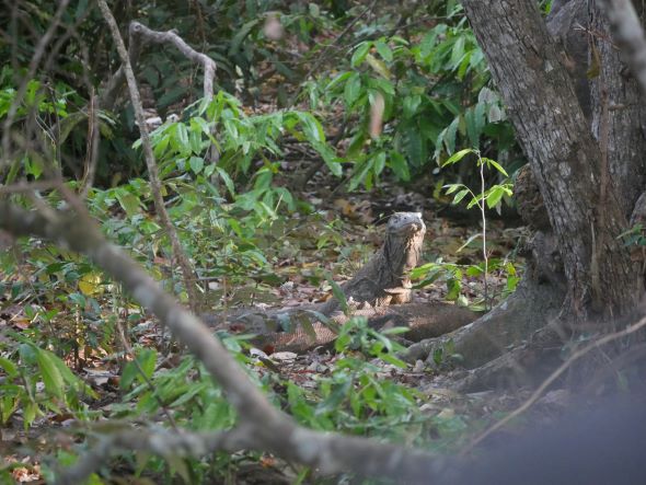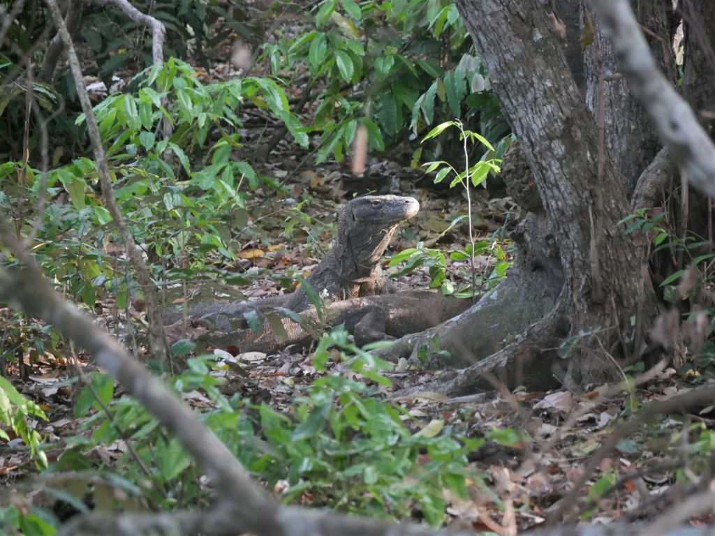 Brandissant ma pagaie de kayak, prêt à me défendre, je me dirige vers la forêt. Jambes tremblantes et cœur battant, comment ne pas être intimidée alors que je suis seule sur la plage où, une minute plus tôt, un dragon de Komodo se promenait le matin avant de se retirer dans le buisson d’où il est venu. Je n’ai pas une ligne de vue claire à cause de la petite dune de sable qui bloque la vue. Est-il parti pour de bon ou m’attend-il juste derrière, prêt à attaquer ? Est-il risqué de faire un pas de plus ? Et un autre ? Courageuse ou inconsciente, je passe la dune sur la pointe des pieds, jusqu’à ce que je le voie. Caché dans le feuillage près d’un tronc d’arbre, je pourrais facilement le prendre pour une branche morte.