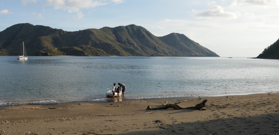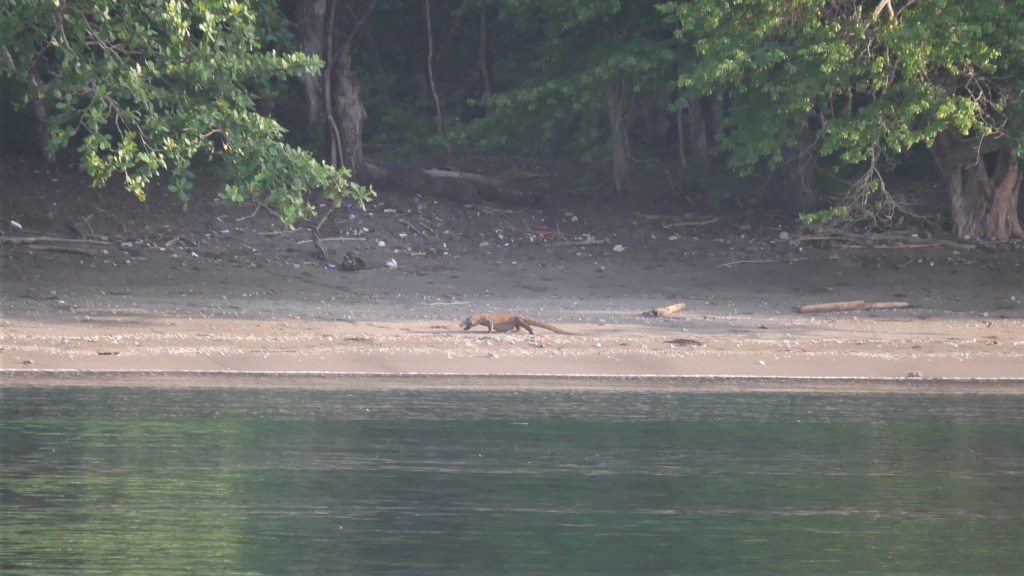Ce sont les autres, qui m’ont finalement rejoint, Thomas et les enfants, bientôt suivis des Cruising Kiwis, qui réalisent que l’autre forme brun-grisâtre couchée sur le côté est un autre dragon de Komodo plus petit. Tôt ce matin-là, je faisais ma série de saluts au soleil sur le pont lorsque j’ai aperçu une forme sombre se déplaçant le long de la plage (au large de Rinca, en face de Lehok Uwada Dasami à Nusa Kode dans le Sud, surnommée à juste titre Dragon Beach) et il n’a pas fallu longtemps pour que je confirme mes soupçons avec les jumelles et que je prévienne tout le voisinage (composé de nos deux bateaux, Obélix et Javelot), en criant à tue-tête “Dragon ! Dragon ! Dragon !” en pointant du doigt le lézard errant et en préparant en même temps mon kayak pour une expédition en solo, impatiente de m’approcher sans avoir à attendre que les autres soient prêts.