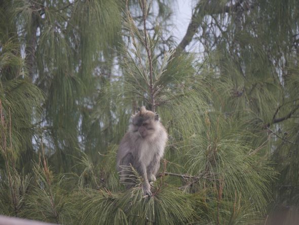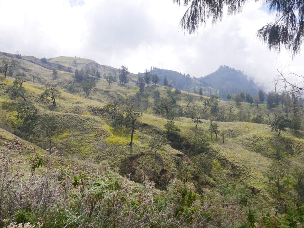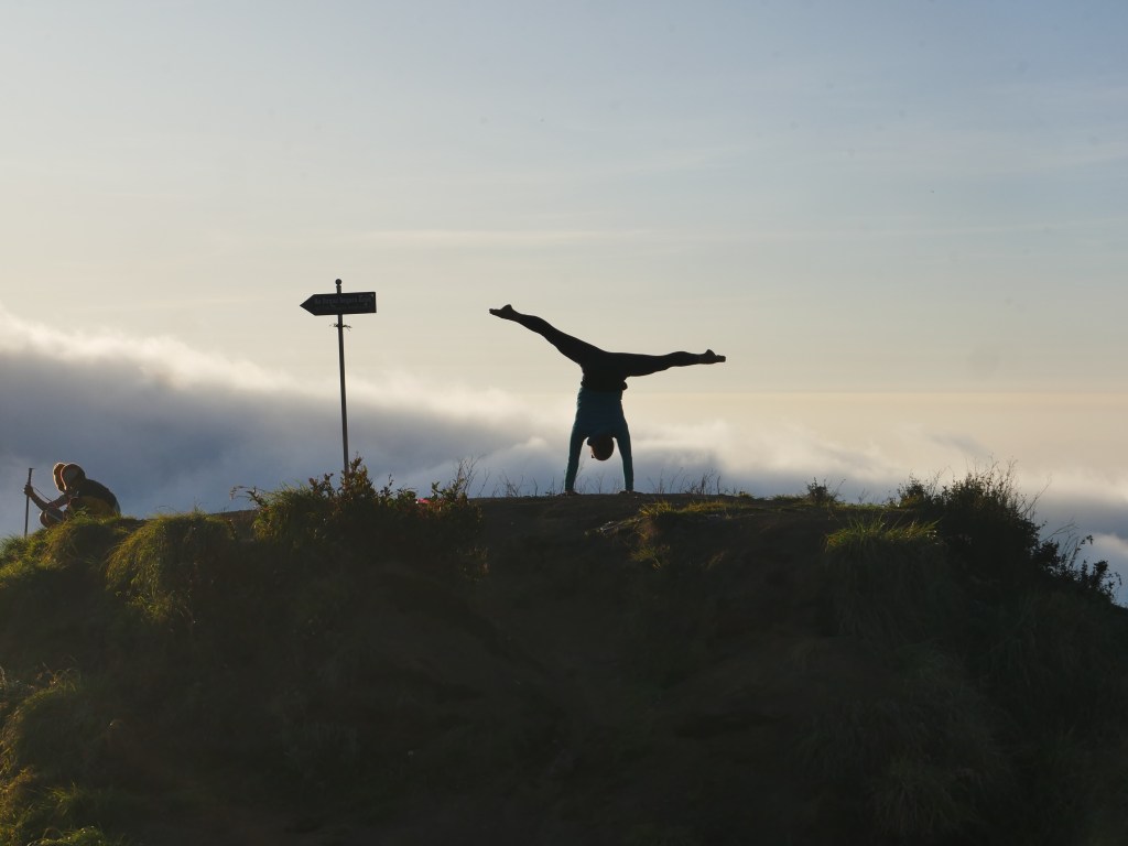 Nous nous souviendrons, outre le bâtiment d’entrée délabré, le chemin pavé d’emballages de bonbons, de l’expectoration régulière de notre guide, du tabagisme du guide et des porteurs, et du tempeh servi à chaque repas malgré le fait que nous n’aimions pas ça et que nous le laissions tout le temps de côté, Zéphyr fier comme un goupillon de voir son argumentation changer notre destin, Azur mimant la Petite Sirène au cours d’une partie de mime, les abris surélevés des pos 1, 2 et 3 offrant un repos bienvenu, les singes agressifs prêts à nous voler notre nourriture et effrayés par nos prétendues attaques au lance-pierre, le doux gazouillis des oiseaux exotiques insaisissables, le paysage alpin avec les Edelweiss, le brouillard accompagnant la dernière partie de notre ascension nous rafraîchissant avec un timing parfait, les tentes Quechua usées, les trois autres groupes de touristes australiens et allemands qui campaient là-haut avec nous et personne d’autre, les toilettes creusées entourées d’une bâche, les bananes frites saupoudrées de fromage râpé et de chocolat pour le gouter, le dégradé de turquoise à jaune presque fluorescent dû aux minéraux du lac dans le cratère, le jeune volcan, en fait pas si petit, encore fumant à l’intérieur du cratère, la pêche aux nuages et les glissades sur poussière au crépuscule, le salut au soleil à l’aube, les pancakes à l’ananas, les frites maison et le club sandwich pour notre dernier petit-déjeuner, et notre photo de groupe à la fin, où j’ai réalisé à quel point nos porteurs étaient petits.