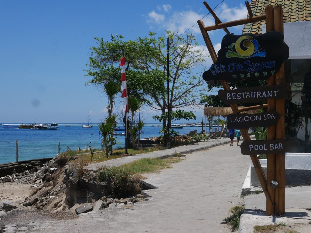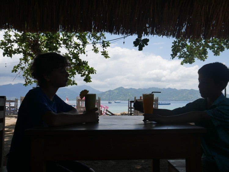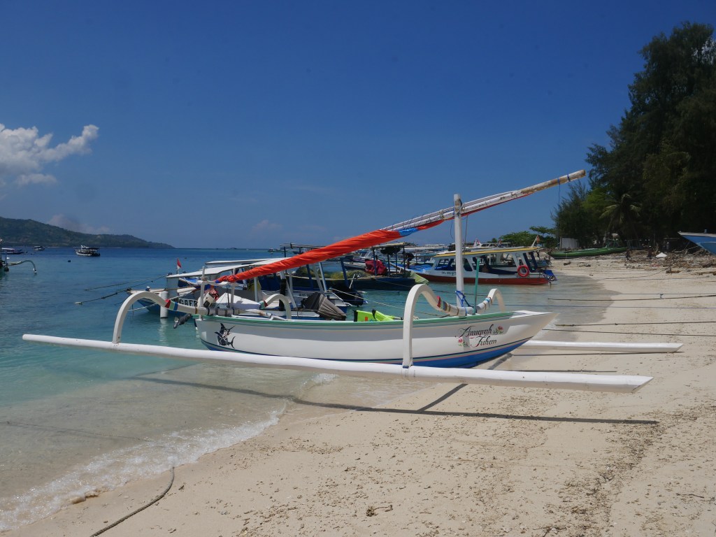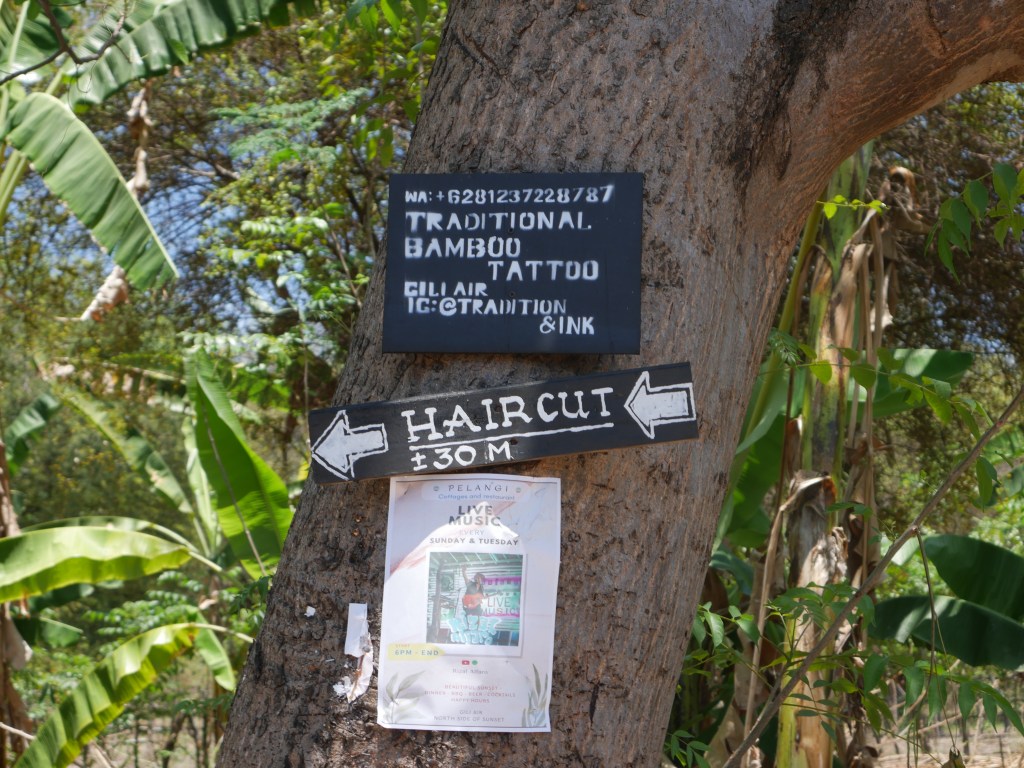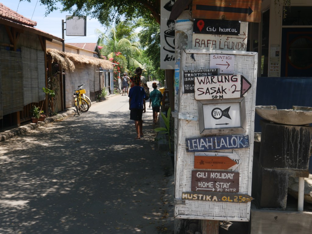 Si je n’avais pas tant la flemme, je vous décrirais plus en détail cette impression que le temps s’est arrêté sur Gili Air, petite île à deux pas de Lombok qui accueille une floppée d’Instagrammers venus de tous horizons qui, juste après avoir débarqué sur la jetée en ferry ou en longboat peints de couleurs vives, se photographient dans des calèches Porsche ou Ferrari ou sur des vélos hollandais de location, en suivant vaguement les panneaux babacool écrits à la main pour se rendre au Rabbit Hole (aucune idée de ce que ça peut bien être, soit dit en passant), chez les tatoueurs traditionnels au bambou, ou dans les cafés et restaurants style européens comme De Puta Madre ou Italy.