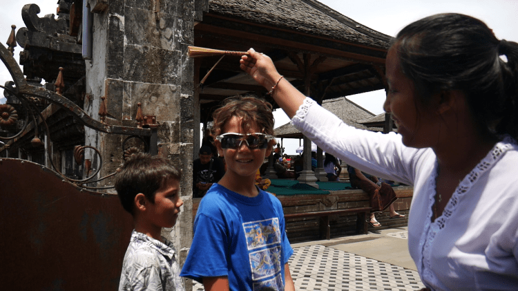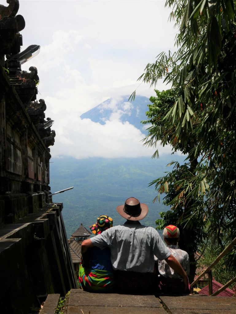So the devotion edifice has turned into an Instagram shit-show with a crowd of tourists, not wandering around the place admiring its architectural singularities, but all gathered on the edges of its main square, sheltering from the sun in the shade of the open-wall huts erected on both sides, half-bored, waiting for their number to be called out so they too can be photographed meditatively praying, summit-gazing or jumping in front of Mt Agung between the Gates of Heaven. Not to mention the deception of the photographer in-chief, holding a mirror horizontally under the camera lens to produce a fake water-reflection effect, tricking the outside world into believing there is a romantic water basin at the temple!