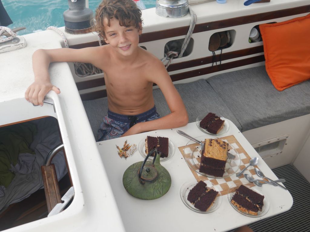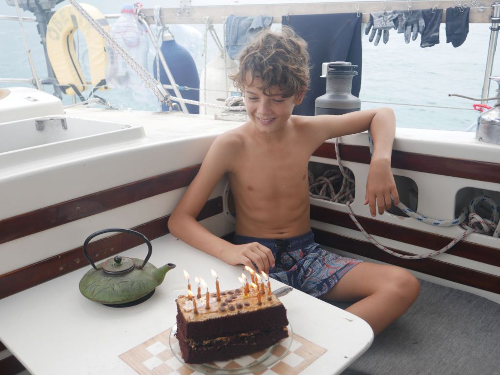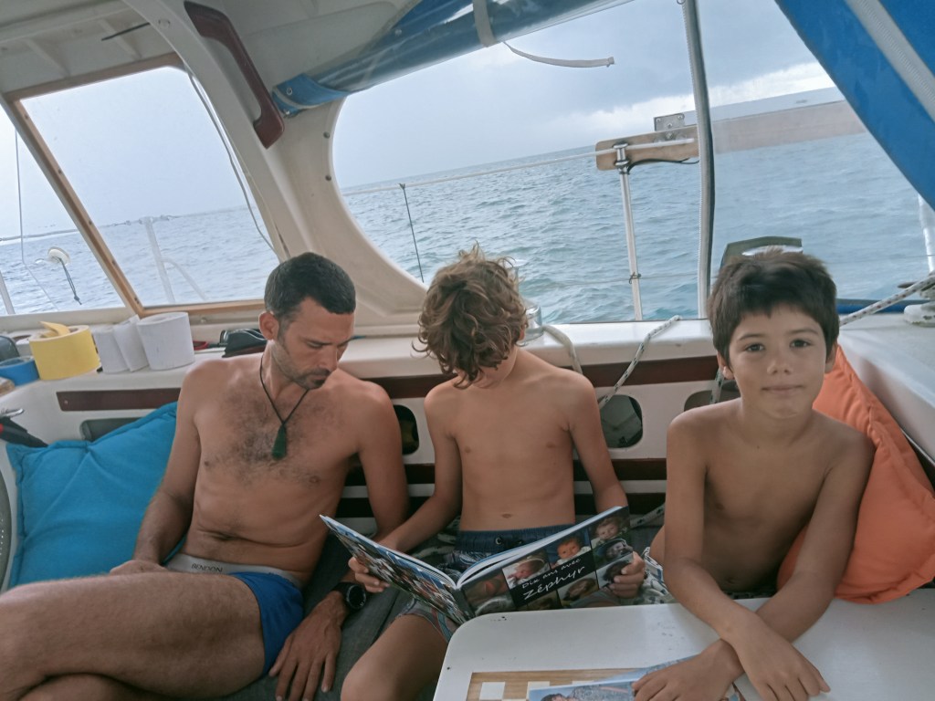 Après une autre longue étape au moteur le jour de l’anniversaire de Zéphyr, le 30 novembre, agréablement passée à célébrer douze ans de parentalité en feuilletant les albums photos de famille avec tendresse, et savourer des crêpes pour le petit-déjeuner, des wraps aux crudités colorés pour le déjeuner suivis d’un scandaleux gâteau au chocolat à deux étages avec glaçage au dulce de leche, et enfin des lasagnes végétariennes, du vin et de nouveau du gâteau pour le dîner avec nos amis et compagnons de route Pascal et Marie-Laure, le jour suivant, qui était censé nous voir célébrer en beauté notre passage de l’équateur, avec Pascal déguisé en Poséidon et tout le tintouin, a pris une toute autre tournure.