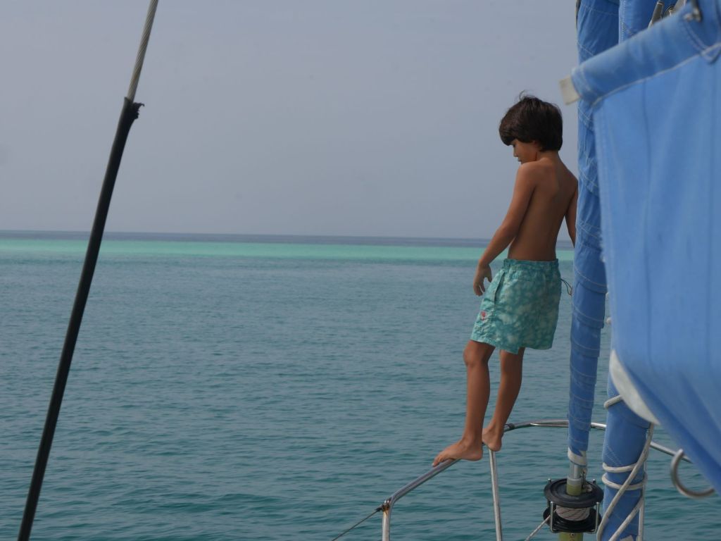 Après vingt-cinq jours de mer, Obélix est enfin immobile, ancré devant Mojeidi, une île déserte au large des côtes érythréennes, en mer Rouge. Nos amis de WOLO, qui nous ont précédés de quelques jours, nous ont informés que l’île abrite une base militaire, mais que les officiers en poste y sont curieux, aimables, et ferment les yeux sur les bateaux qui se remettent de leur traversée de l’Indien ou qui s’abritent du gros temps.