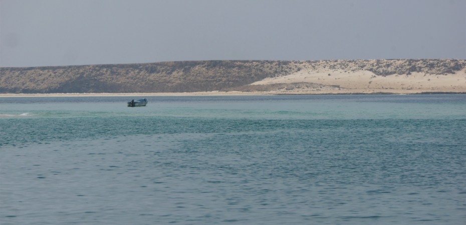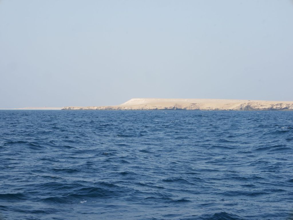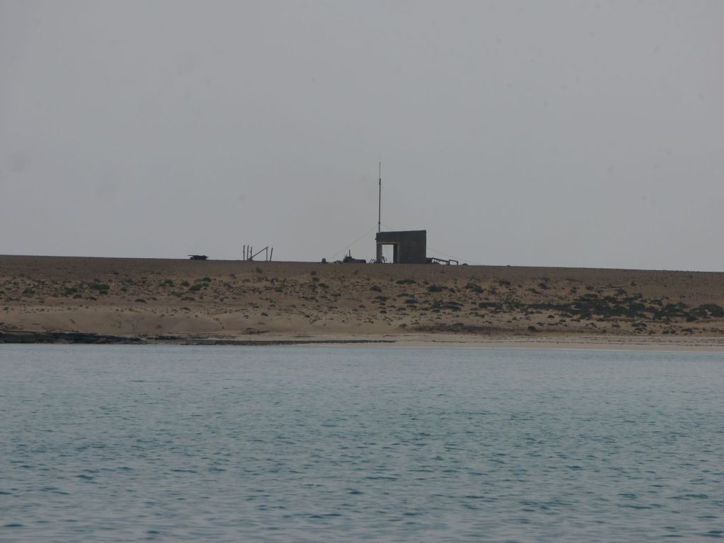 L’île est essentiellement plate et sablonneuse, avec une élévation maximale de quelques mètres, sans végétation apparente, et entourée d’une eau turquoise, quoique presque opaque. A son sommet, une antenne plantée sur un bloc de béton brut semble leur servir de station de communication et quelques centaines de mètres plus loin, deux autres abris délabrés doivent leur servir de logement. De temps à autre, nous distinguons des silhouettes longilignes noires qui vont et viennent sur le fond ocre, un paysage pittoresque que j’aimerais, si j’avais le talent de notre ami Gaspar, pouvoir peindre en aquarelles.