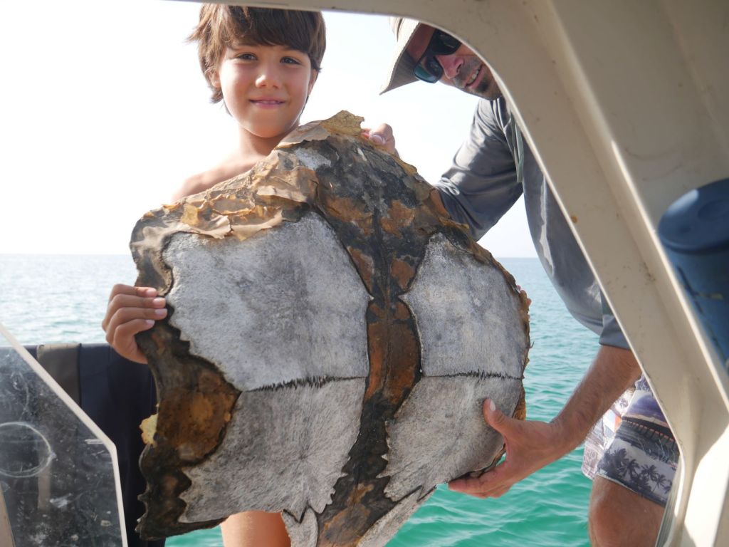 Plus tard dans la journée, après avoir manqué un gros barracuda qui nous taquinait en nageant juste sous notre nez près de la coque, Thomas réussit à pêcher au harpon trois gros spécimens et apporte le plus gros à nos nouveaux amis. Reconnaissants, ils l’autorisent exceptionnellement à descendre à terre et lui font même visiter leurs quartiers, un dortoir avec quatre lits de fortune dans un hangar et des mitrailleuses accrochées au mur, et un coin cuisine avec un feu ouvert dans l’autre. Lorsqu’il demande des œufs de échange, ils sont désolés de ne pas en avoir, mais lui conseillent d’aller voir sur l’île d’Aucan, à 2 milles nautiques de là, du côté nord… où les tortues nichent.