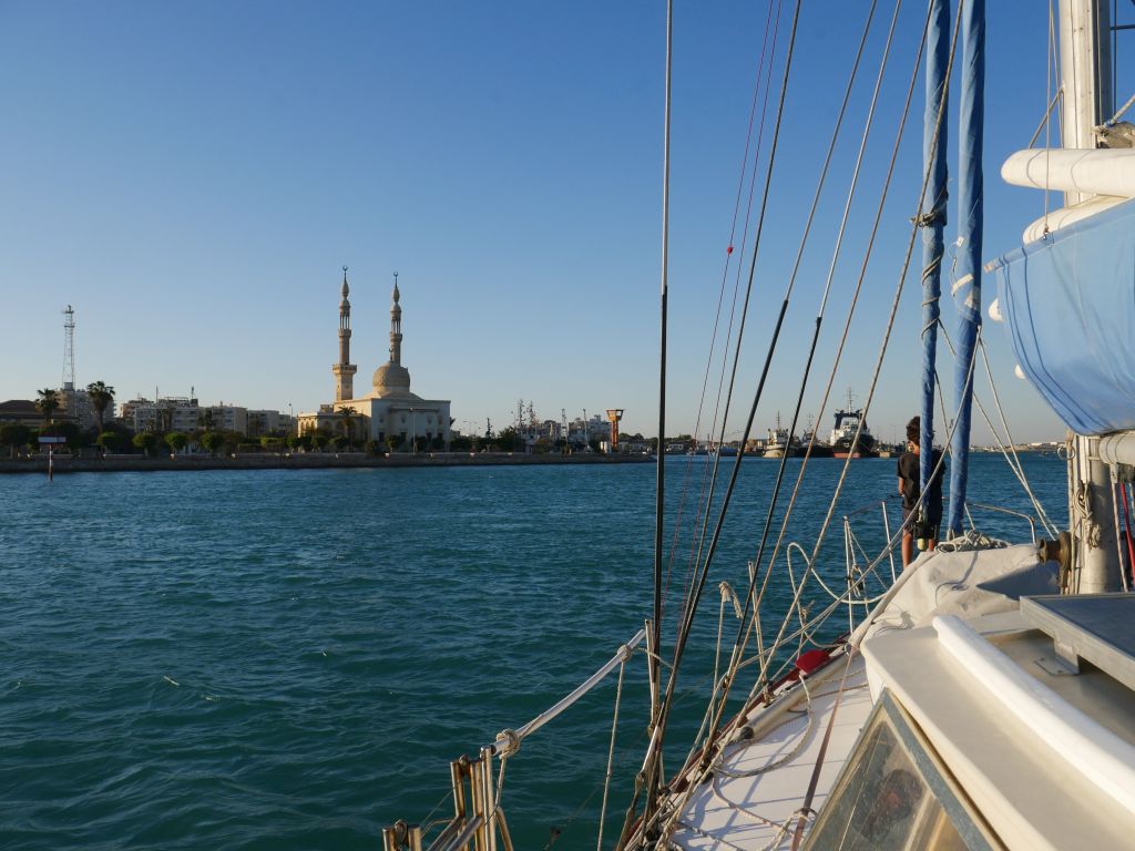 Le dernier tronçon de navigation entre la baie de Soma et Suez a été épouvantable, avec des vents forts et une mer courte. Mais nous étions déterminés à ne pas manquer cette “fenêtre”, car la météo prévoyait pire apres, ce qui nous aurait fait attendre encore une semaine ou plus. Cette option n’était pas souhaitable compte tenu de nos stocks et de notre souhait de se joindre à Girotondo (qui remontaient tres bien au vent) pour une excursion à terre en Égypte. Nous avons donc tenu bon et zigzagué entre le continent africain et le Sinaï, subissant les limitations d’Obélix au près avec résignation et patience (Thomas), et frustration totale (moi) me sentant inutile et misérable, allongée dans ma couchette de quart, jusqu’à ce que nous atteignions Suez juste avant le coucher du soleil, accueillis par nos amis de Girotondo, Taravana et Laika, recevant avec émotion et soulagement le dernier prix de la flotte.