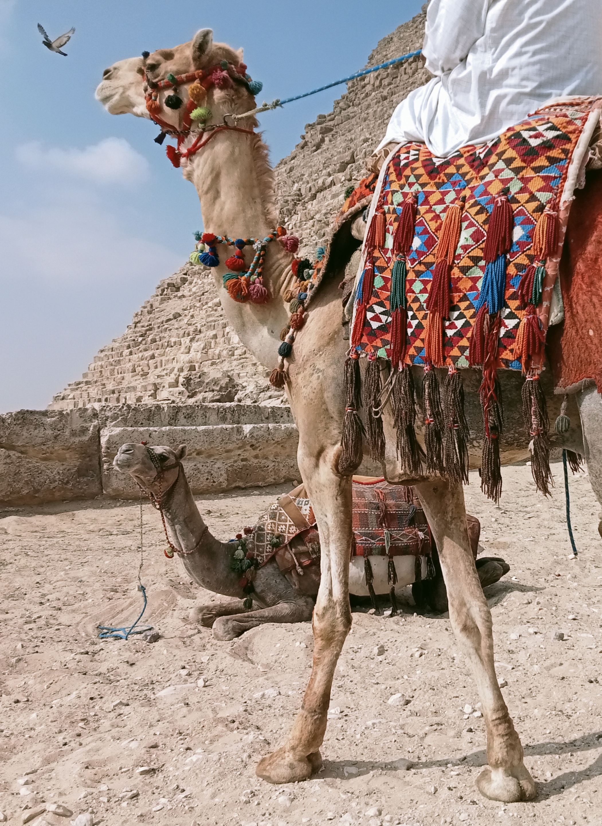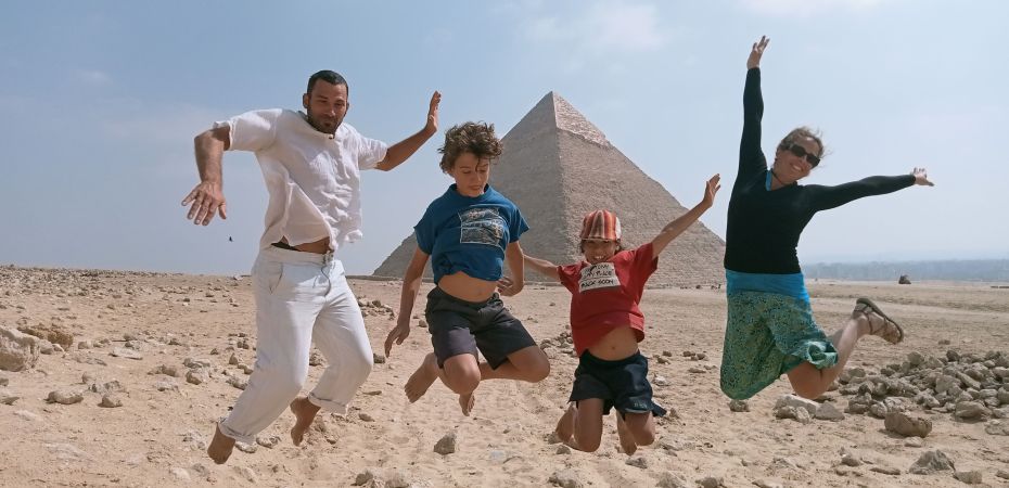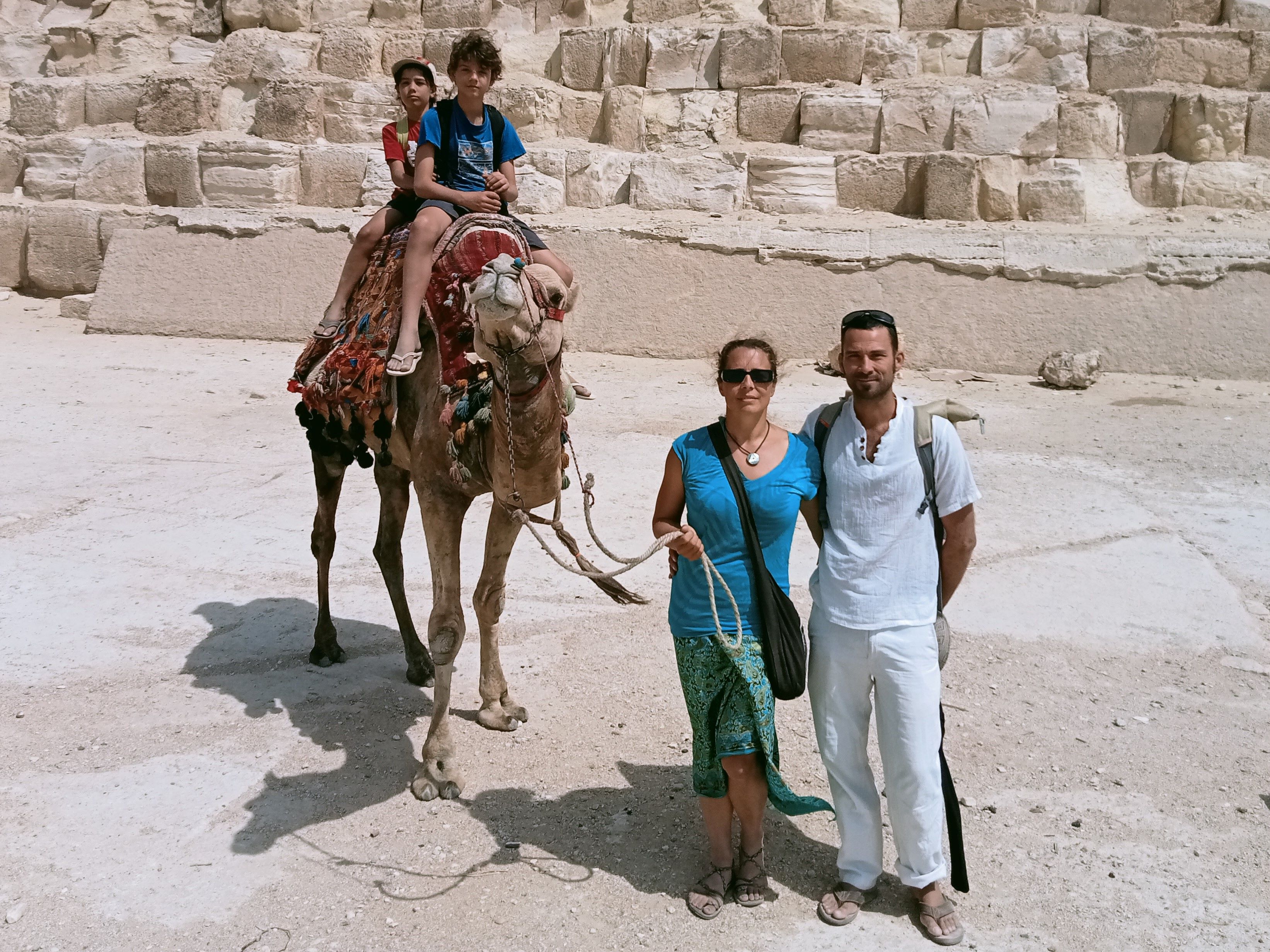 Notre échappée Egyptienne s’est soldée par un retour au Caire et un passage aux pyramides en sortie de train de nuit, à la fraiche, évitant du même coup le soleil aggressif et les hordes touristes qui débarquaient vers dix heures, lorsque nous quittions le site après un petit tour en dromadaire pour les enfants. Bien que couteuse en énergie ainsi qu’en argent (dont on a appris qu’il était, en Egypte ancienne, beaucoup plus précieux que l’or), nous sommes revenus de cette virée, qui coïncidait opportunément avec l’anniversaire de Thomas, éblouis par tant de beauté, d’antiquité, et de monumentalité, avec une nouvelle pelleté de souvenirs immuables plein la caboche.